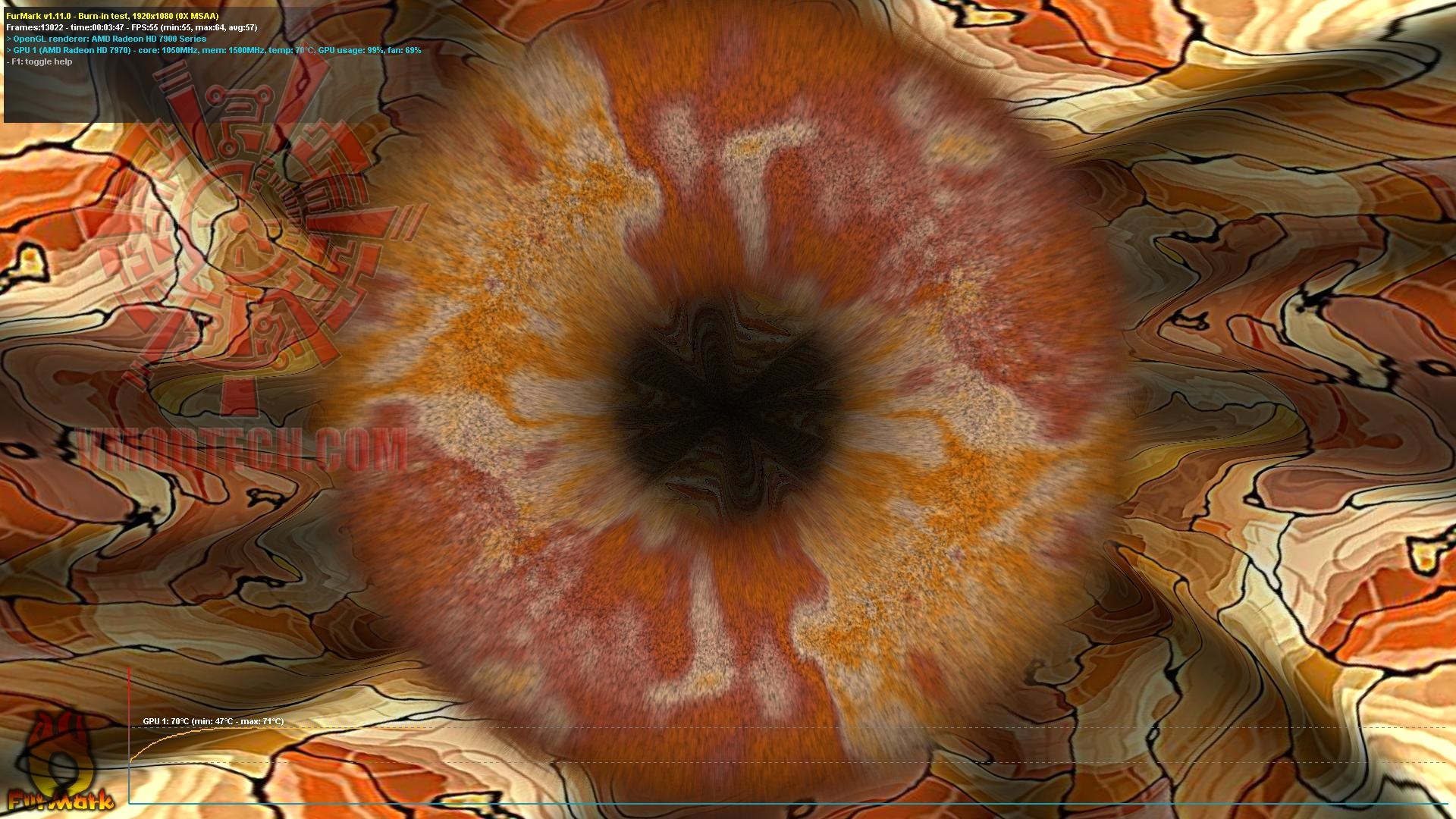 อุณหภูมิของการ์ดขณะ Furmark นั้นจะอยู่ที่ไม่เกิน 71 องศา รอบพัดลมออโต้ที่ รอบประมาณ 70% เท่านั้นครับ ถ้าปรับรอบให้จัดกว่านี้ก็เย็นกว่านี้แต่เสียงก็จะดังขึ้นด้วย