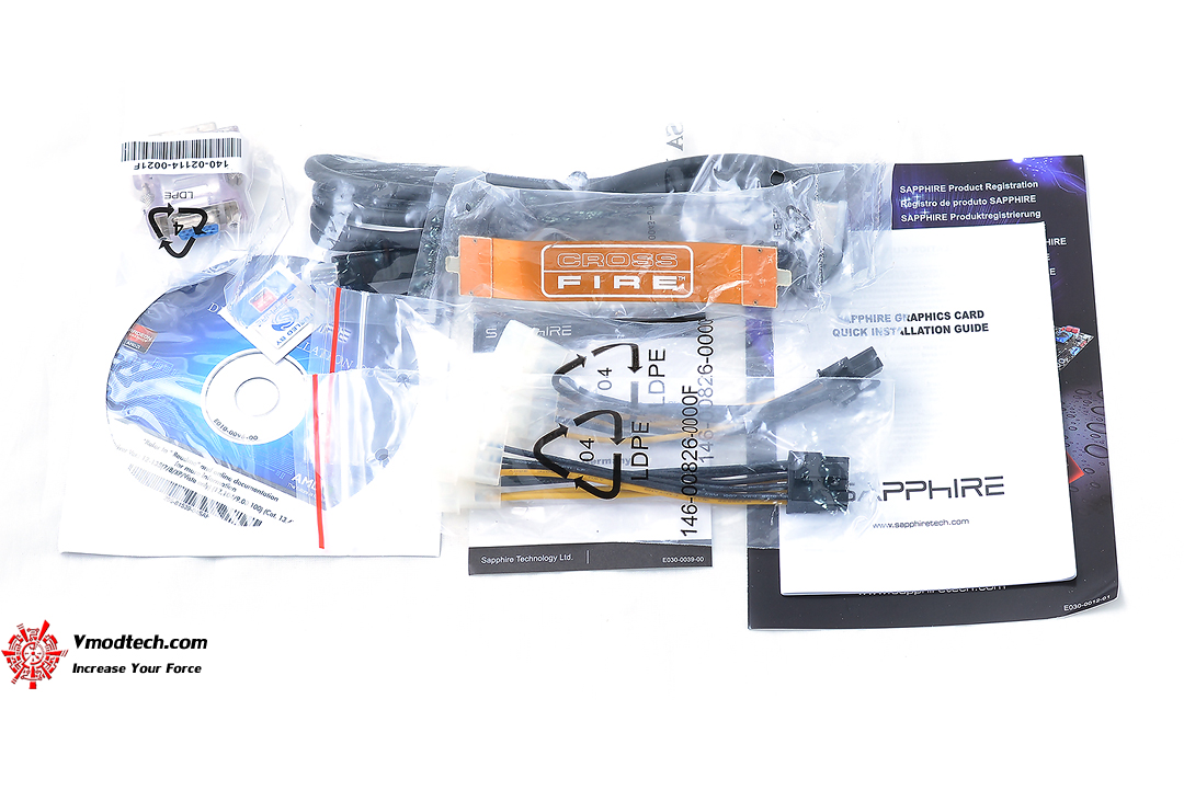 ภายในกล่องที่ได้รับมาก็จะมีอุปกรณ์เท่าที่เห็นนี้ หัวแปลงไฟโมเร็กเป็น PCIe 8 พินสองหัว คู่มือ และหัวแปลงเอาท์พุท Dsub to DVI, bridge CrossFire หนึ่งเส้น, สาย HDMI อีกหนึ่งเส้นครับ