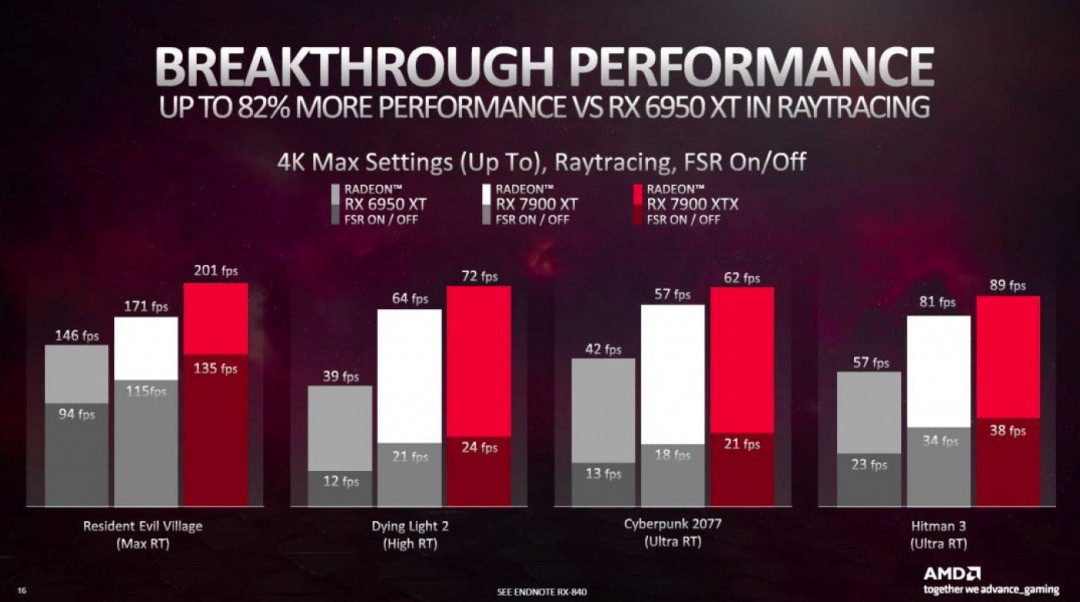กับเกมส์ยุคใหม่ที่มี Raytracing นั้น เมื่อเทียบกับการ์ด RX 6950 นั้น RX 7900 XTX จะแรงกว่า ได้เฟรมเรทมากกว่าถึง 82%
