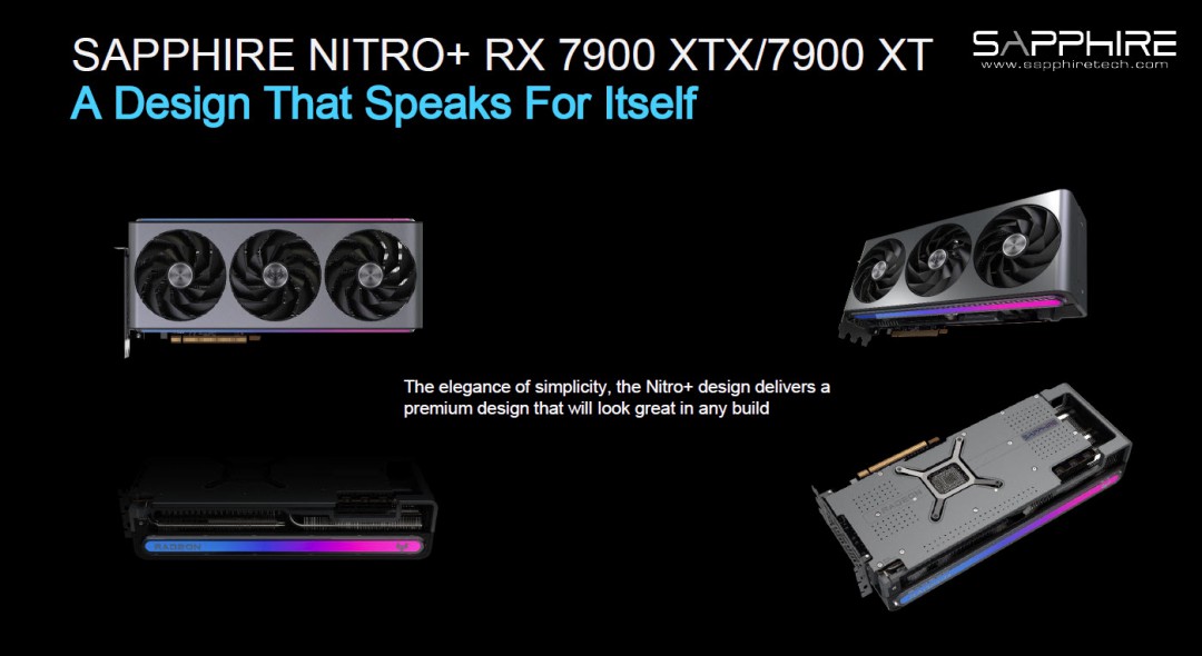สิ่งที่เห็นได้ชัดเจนมากที่สุดของ Nitro+ RX 7900 XTX และ Nitro+ RX 7900 XT ก็คือการออกแบบฝาครอบการ์ดที่ผนวกเอาความเรียบหรูเข้ากับแสงสี RGB แบบที่ไม่เลอะเทอะ สวยงามกำลังดีครับ ดูสง่างามมากเมื่อเสียบใช้งาน