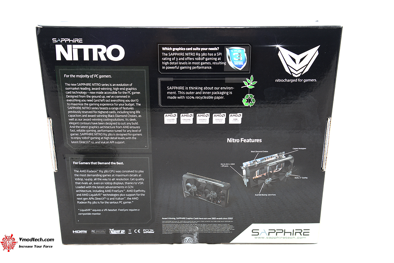 มากันในกล่องสีดำบอกสเปคการทำงานคร่าวๆหน้ากล่องพร้อมทั้งฟีเจอร์ต่างๆและชื่อรุ่น SAPPHIRE NITRO R9 380