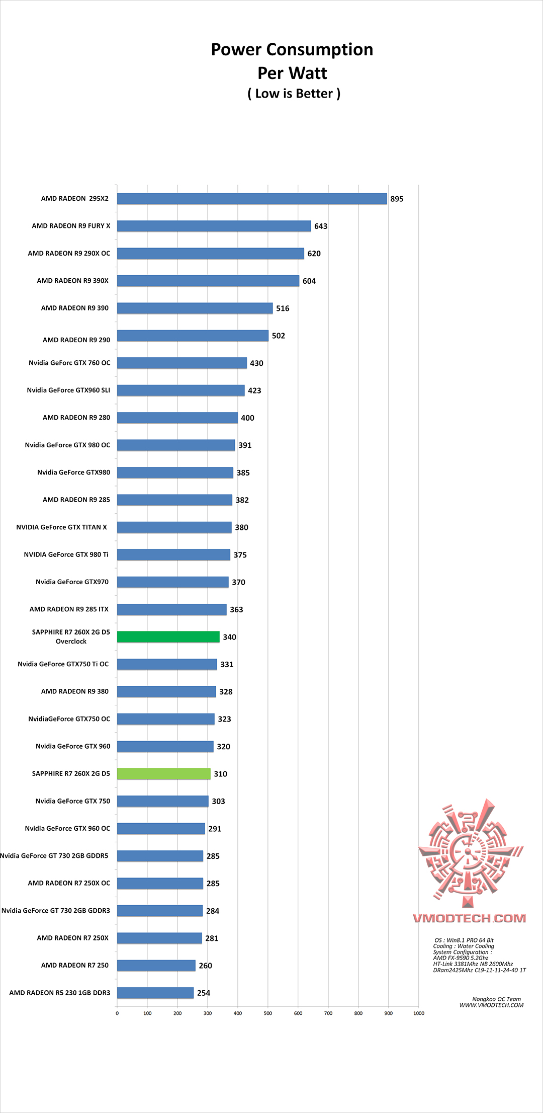 อัตราการ บริโภคไฟก็อยู่ในระดับการ์ดจอระดับกลางของ AMD ครับ ต่อไฟเลี้ยง 6พิน 1ช่อง ด้วยในสถานะเดิมๆกินไฟที่ 310วัตต์ ส่วนสถานะโอเวอร์คล๊อกกินไฟ 340วัตต์ในการเทส Furmark โดยระบบที่ใช้ทดสอบด้วยซีพียู FX-9590 ที่มีค่า TDP 220W และยังอัดกันไปที่ 5.2Ghz ถือว่าใช้ได้ครับ ถือว่าประหยัดดีเลยทีเดียว