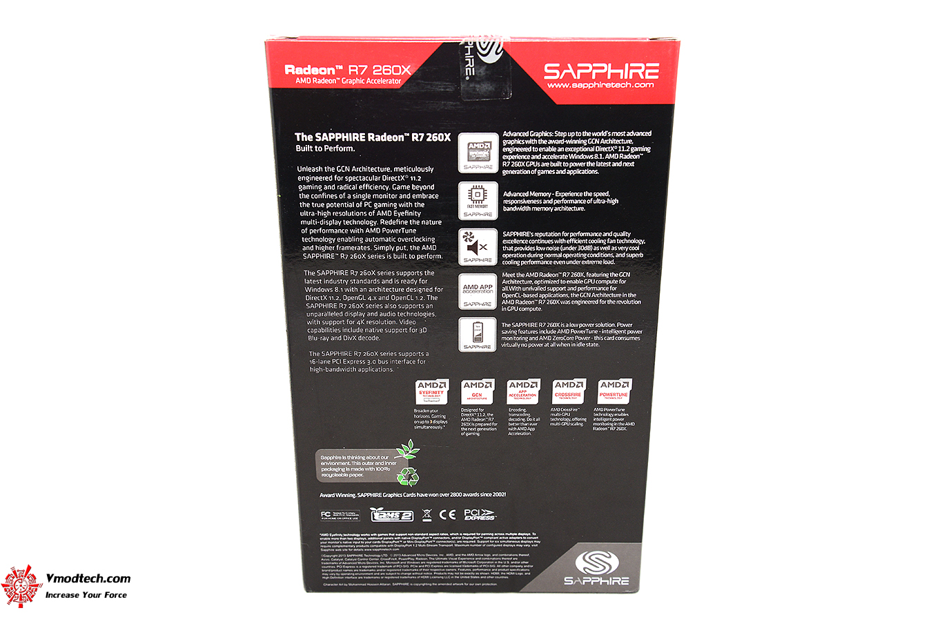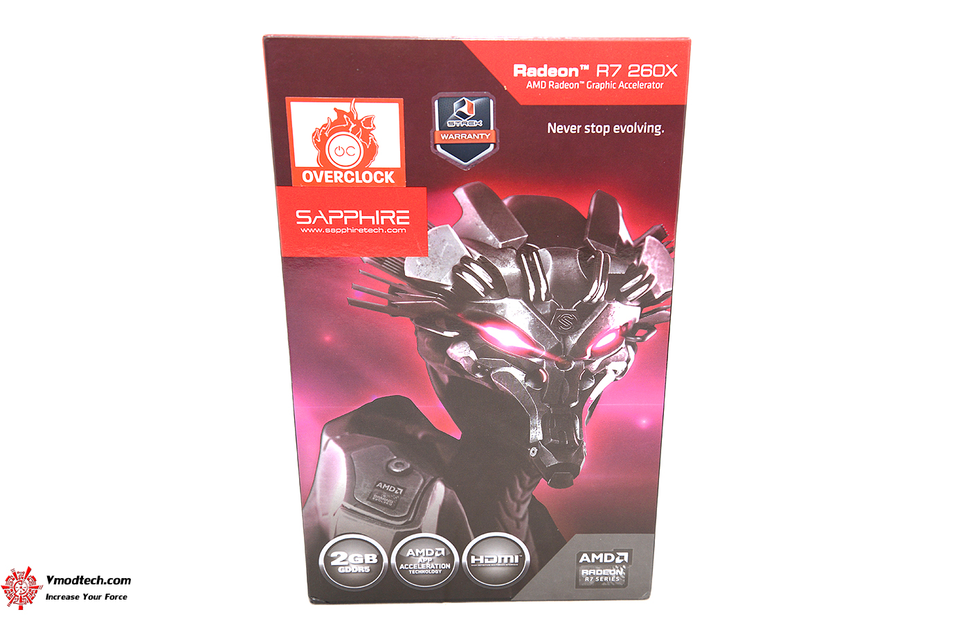 กล่องของ SAPPHIRE R7 260X 2G D5 มาในโทนสีแดงบอกรายละเอียดต่างๆด้านหน้ากล่องครบถ้วน