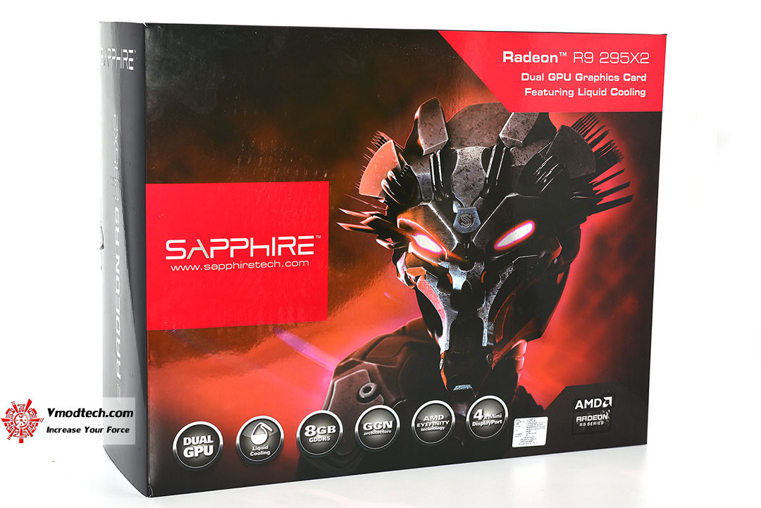 กล่องบรรจุ SAPPHIRE Radeon R9 295X2 ครับ มาสไตล์ Sapphire ยุคใหม่ด้วยกล่องมันวาว และมันมีขนาดใหญ่มากๆ