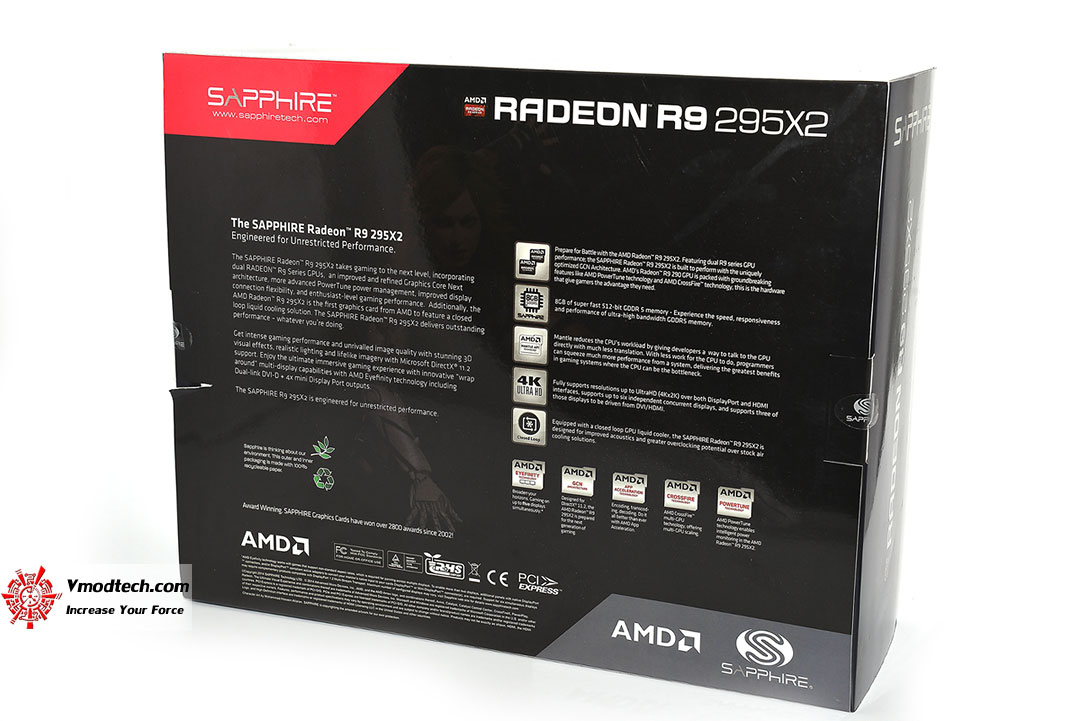 ด้านหลังกล่องบรรจุ SAPPHIRE Radeon R9 295X2 นั้นจะมีรายละเอียดคุณสมบัติต่างๆที่ติดตัวมากับ GPU