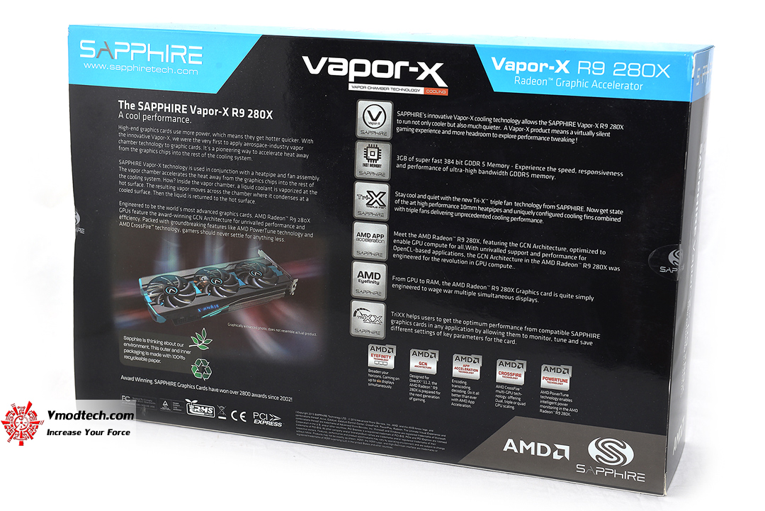กล่องบรรจุ SAPPHIRE VAPOR-X R9 280X 3GB GDDR5 TRI-X OC WITH BOOST ครับ มาสไตล์ Sapphire ครับ กล่องเคลือบเงาสวยงามพร้อมกับภาพหุ่นยนต์ที่เป็นเอกลักษณ์