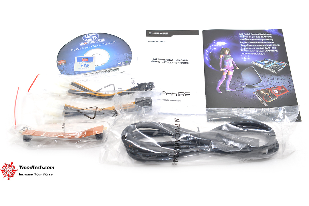 อุปกรณ์ที่มากับชุด ก็จะมี DVD Driver และเอกสารบรรยายรายละเอียดการ์ดรวมถึงคู่มือการติดตั้งเบื้องต้น หัวแปลงไฟจากโมเร็กเป็น PCIe แบบแปดพินสองเส้น สาย HDMI หนึ่งเส้น และบริดจ์ CrossFire อีกหนึ่งเส้น