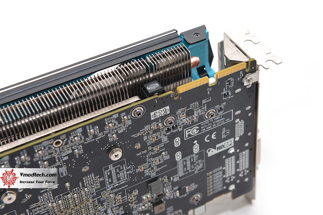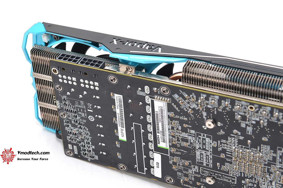 ต้องการใช้ไฟแบบ PCIe 8 พินสองหัว และจะเห็นตรงสันการ์ดครับมีโลโก้ Vapor-X ซึ่งเมื่อเสียบไฟใช้งานแล้วจะมีแสงสว่างบริเวณนี้ด้วย