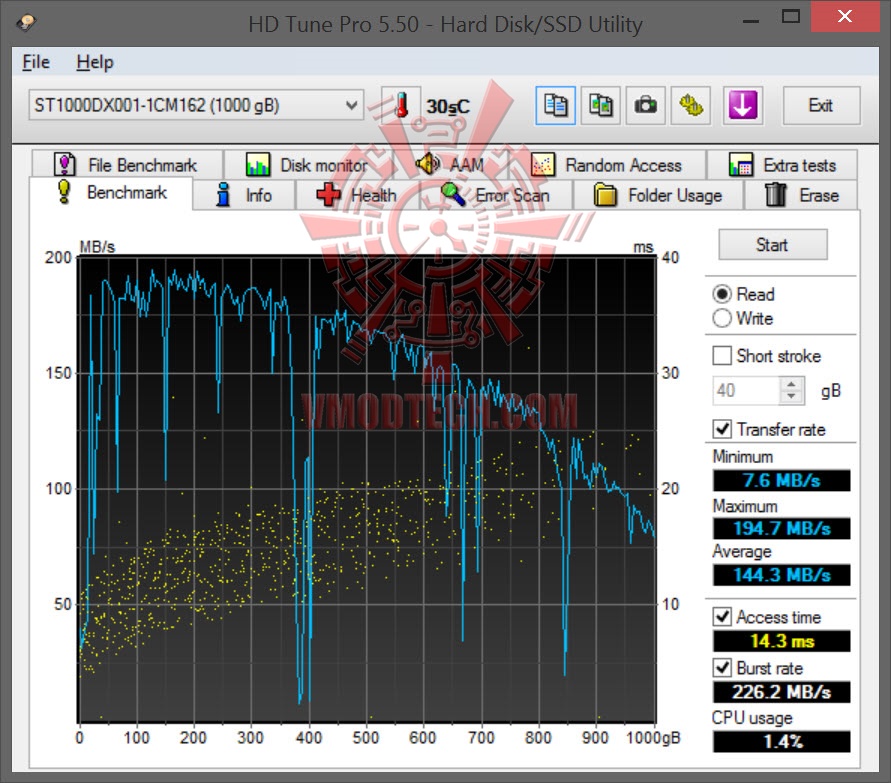 ประสิทธิภาพของการอ่านจาก HDTune นั้นถือว่าเยี่ยมครับได้ค่าเฉลี่ยแถวๆ 144 เมกกาไบท์ต่อวินาที ส่วนเวลาในการเข้าถึงไฟล์นั้นอยู่ที่ประมาณ 14.3 มิลลิเซกครับ