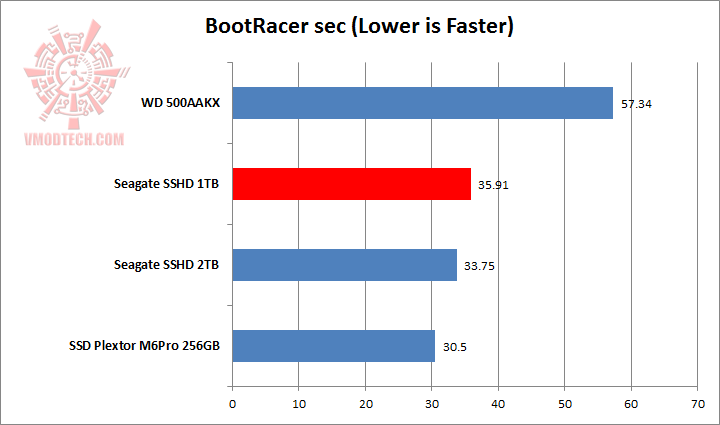 สำหรับเวลาในการบู๊ทเข้าวินโดว์และพร้อมใช้งานนั้น เจ้า Seagate SSHD 1TB นั้นจะช้ากว่าตัว 2TB เล็กน้อย และช้ากว่า SSD ตัวมาตรฐานอยู่ประมาณเกือบๆ 6 วินาที ซึ่งถือว่าเร็วมากเมื่อเทียบกับ HDD ตัวแรงอย่าง WD500AAKX ที่ต้องใช้เวลากว่า 58 วินาที