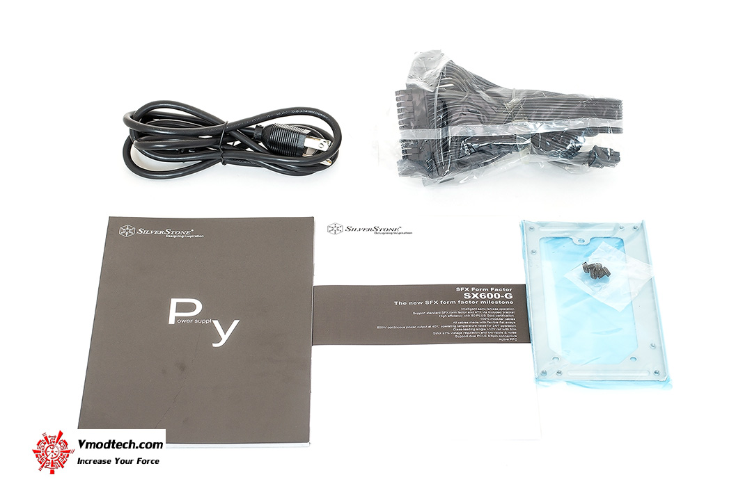 ภายในกล่องก็มี สายไฟต่างๆ, เคเบิลไทร์, คู่มือต่างๆ, สกรู 4 ตัว และ bracket แปลงเมาท์ จาก SFX ไป ATX สำหรับใช้กับ ATX case ครับ