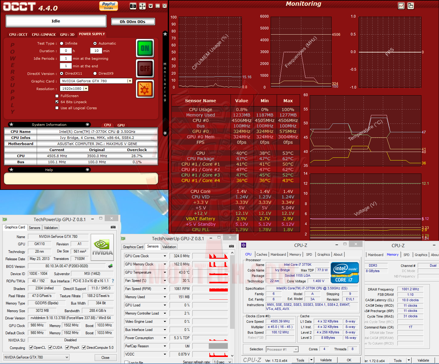 วันนี้จะ ใช้ CPU I7 3770K ครับ Overclock ไปที่ 4.5 GHz ใช้ไฟเลี้ยงเกินขนาดไปที่ 1.4 V ครับ ต่อกราฟิกการ์ด MSI Geforce GTX780 Lightning