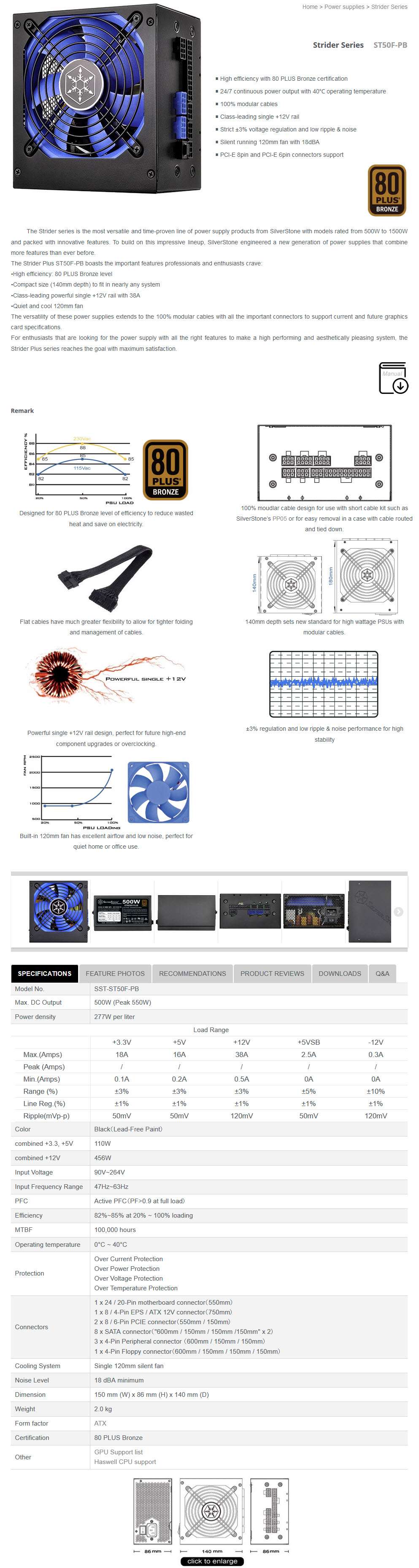 ……….สวัสดีวันนี้มี Power Supply จาก SilverStone มาฝากกันอีกแล้วครับ กับ SilverStone Strider Plus Series ST50F-PB ซึ่งเป็น Power Supply ขนาด 500 Watt การันตีด้วย 80 PLUS® Bronze กำลังไฟนั้นต้องบอกว่าเอากราฟิกการ์ดรุ่นใหญ่ๆแบบใบเดียวอยู่แน่นอนครับ เพื่อไม่ให้เป็นการเสียเวลาไปลุยกันเลยดีกว่า แต่ก่อนอื่นไปชมรายละเอียดจากเว็บไซต์ผู้ผลิตกันก่อนครับ