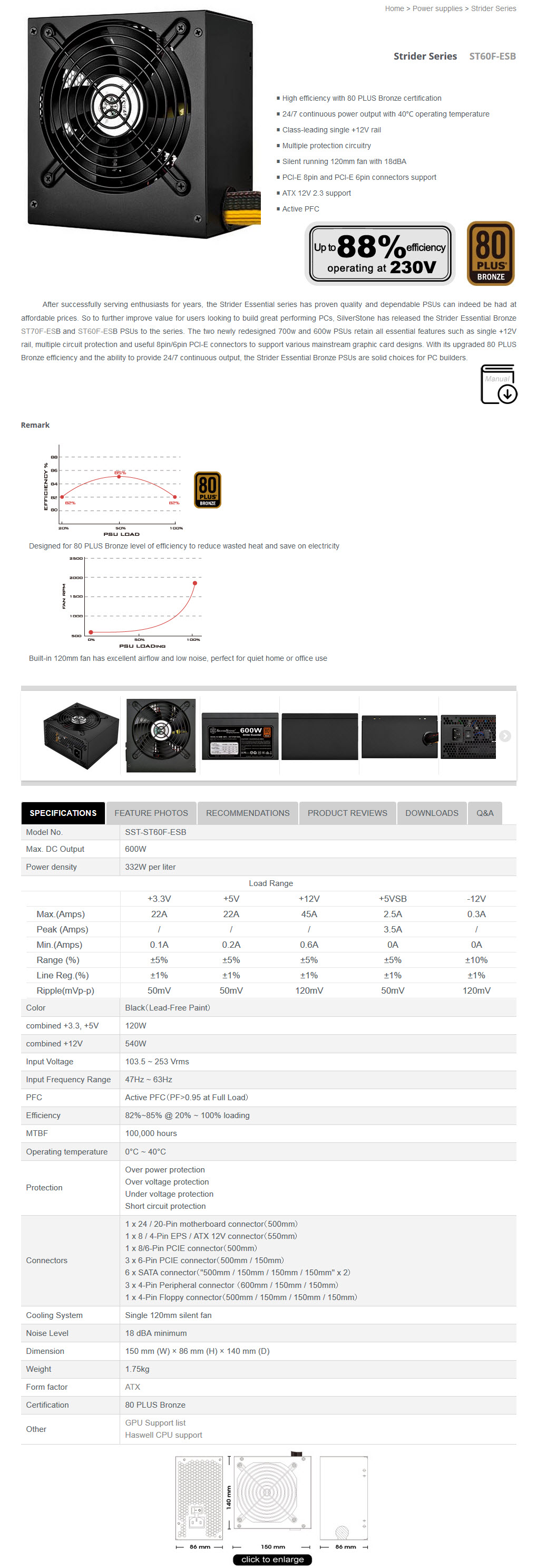 ……….สวัสดีวันนี้มี Power Supply จาก SilverStone มาฝากกันอีกแล้วครับ กับ SilverStone Strider Series ST60F-ESB 80Plus® Bronze ซึ่งเป็น Power Supply ขนาด 600 Watt การันตีด้วย 80 PLUS® Bronze ซึ่งกำลังไฟนั้นเป็นขนาดพอเหมาะพอเจาะกับเครื่องเล่นเกมส์แรงแบบกลางๆค่อนไป ทางสูงเลยละครับ และต้องบอกว่าสามารถเอากราฟิกการ์ดรุ่นใหญ่ๆแบบใบเดียวอยู่แน่นอนครับ หรือจะ SLI หรือ crossfire รุ่นนี้ก็รองรับครับ เพื่อไม่ให้เป็นการเสียเวลาไปลุยกันเลยดีกว่า แต่ก่อนอื่นไปชมรายละเอียดจากเว็บไซต์ผู้ผลิตกันก่อนครับ
