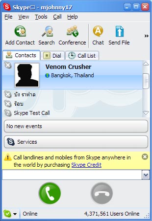 และนี้คือหน้าตาของโปรแกรม Skype ครับ ใช้งานง่ายมากๆ เหมือนกับ msn เกือบทุกอย่าง แค่ add ชื่อคู่ขา/แฟน/เพื่อน/พ่อ แม่ พี่น้อง หรือ ใครๆ ก็ได้ที่อยากจะคุยด้วย ขอแค่คู่สายมีโปรแกรมตัวนี้อยู่ในเครื่อง กดโทรออก เพียงเท่านี้ เพื่อนๆ ก็จะได้คุยโทรศัพท์กันอย่างเมามันครับ ตังค์ก็ไม่ต้องเสียไม่ว่าโทรกี่ล้านที ส่วนเรื่องคุณภาพของเสียง จากความเห็นส่วนตัวของผม ผมว่ามันชัดเอามากๆ เลยครับ สามารถคุยโต้ตอบกันได้ เหมือนโทรศัพท์ทุกประการ คุยเป็นชั่วโมงๆสบายๆ แบบหูไม่พัง แต่บางครั้งอยากจะมีการ lag ของเสียงบ้างเล็กน้อยถ้าตอนนั้นผมโหลด อะไรอยู่ แต่ถ้าเนตแรงๆคงจะไม่มีปัญหาอะไร ไงเพื่อนๆก็ลองไปเล่นกันดูนะครับ หวังว่าบทความครั้งนี้ของผมคงมีประโยชน์กับเพื่อนๆบ้างนะครับ พบกันใหม่บทความหน้า สวัสดี :)