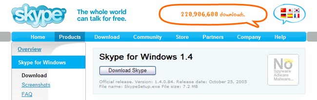 หน้าตาของ web skype ครับ สีฟ้าสวยงาม ส่วนอื่นไม่ต้องสนใจ กดที่ Download กันเลย