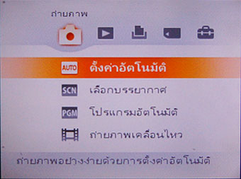 เมนูแรกเป็นเรื่องของการถ่ายภาพคับ เป็นการเลือกว่าถ่ายแบบอัตโนมัติ (Auto) แบบเลือกบรรยากาศ (Scene Shot) โปรแกรมอัตโนมัติ (Program) หรือว่าภาพเคลื่อนไหวคับ