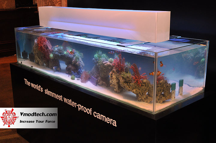 ที่อยู่ในตู้ปลาทะเลขนาดใหญ่ก็คือกล้องดิจิตอลตัวใหม่ล่าสุดจากไลน์ Cybershot กับ TX5 ที่มีคุณสมบัติพิเศษที่เป็นกล้องกันน้ำลึก 3 เมตร ที่บางที่สุด ณ ขณะนี้ และสามารถทนอุณหภูมิได้ต่ำสุดถึง -10 องสา และกันกระแทกที่การตกจากความสูง 1.5 เมตร