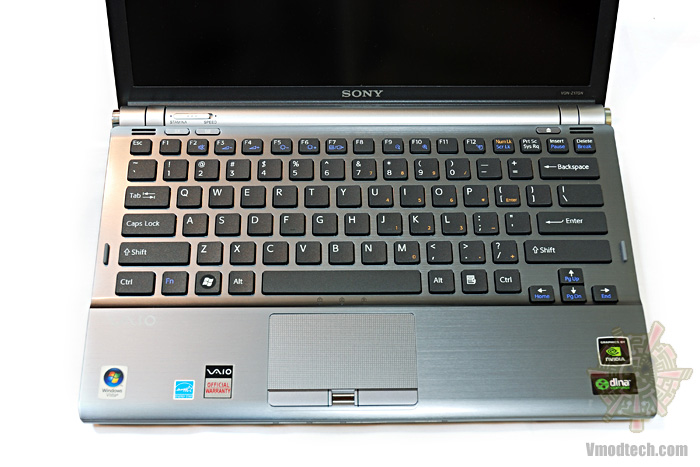 มาดูในกาบของเจ้า Vaio Z กันบ้างครับ เมื่อเปิดฝาออกมา สิ่งที่ผมสู้สึกก็คือ ฝาเปิดง่ายดีครับ เอิ้กๆ แต่อย่างไรก็ดี ขณะที่ผมทดลองใช้มือข้างเดียว ยกฝาขึ้นมา ตัวฐานเครื่องนั้นก็ลอยตามขึ้นมาด้วยครับ … แล้วผมก็ทำตก ปุ๊ (….) จริงๆไม่ใช่ครับ ผมต้องใช้มือสองข้างในการเปิดฝาโน๊ตบุ๊กเครื่องนี้ (ตรงนี้ผมจัดว่าเป็นข้อเสียนิดๆหน่อยๆที่คนดีไซน์ชอบมองข้าม) แต่ว่า หากมองกันถึงขนาดและน้ำหนักที่เบา ผมก็คิดว่า คงจะเป็นไปได้ยากครับที่จะทำให้ฝาสามารถเปิดได้ด้วยมือข้างเดียวได้ คีย์บอร์ด ลักษณะเป็นปุ่มลอยออกมา ขนาดใหญ่เท่าๆกันทุกปุ่ม จัดว่าให้ความสะดวกสบายดีครับ ทัชแพด อยู่ในเกณฑ์ดีครับ แป้นพิมพ์ ทำจากอะลูมิเนียม อีกต่างหาก ครับ