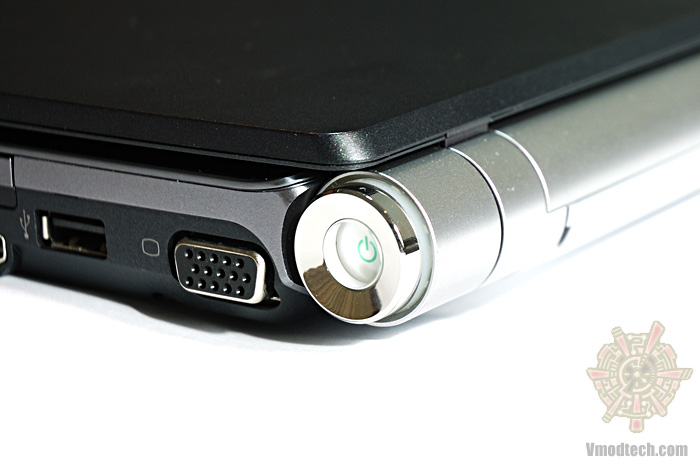 แกนพับ เป็นลักษณะทรงกระบอก และมีปุ่มเปิดปิดอยู่บริเวณด้านข้าง ดังรูปครับ (ปุ่มเปิด คล้ายๆ Asus เลยแฮะ) ส่วนของบานพับนั้น แข็งแรงทนทานดีครับ มีความฝืดในระดับหนึ่ง และไม่จำเป็นต้องมีที่ล็อคจอครับ