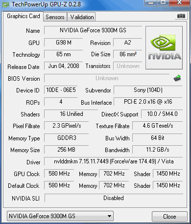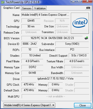 | Graphics | Intel Mobile GM45 (64mb Shared)/ Nvidia Geforce Mobile 9300GS (256mb) |