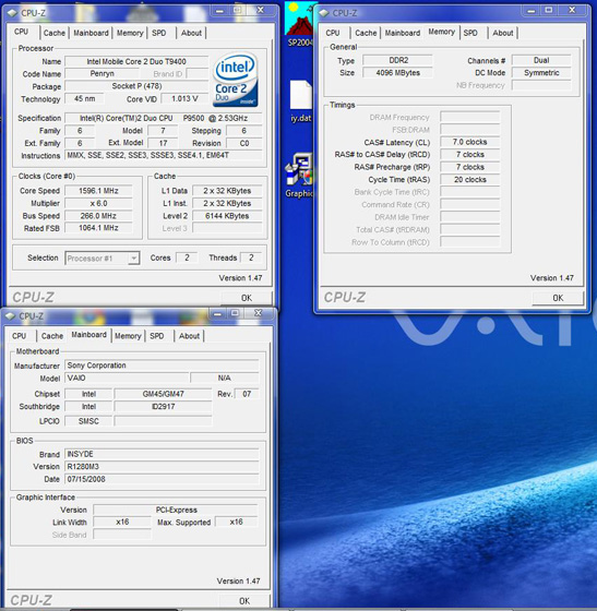 โปรแกรม CPU-Z 1.47 ที่ผมเพิ่งไปโหลดมาสดๆร้อนๆ ไม่รู้ว่าตอนนี้มีออกมาใหม่อีกรึยัง ยังคงเอ๋อๆอยู่กับ P9500 ครับ เห็นเป็น T9400 ซะอย่างนั้น แต่รายละเอียดอื่นๆก็แสดงได้ครบถ้วน ยกเว้นแรม ยังคงเห็นเป็น DDR2 และไม่สามารถแสดงความเร็วได้ครับ แต่ CL นั้นคงจะถูกต้องครับ เป็น CL7 มาตรฐาน DDR3 1066 ส่วน GPU-Z ก็สามารถแสดงรายละเอียดต่างๆได้ถูกต้องดีครับ แต่หนูพีชก็ยัง คง งง ว่ามันคืออะไร อิอิ กรรม