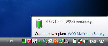 1.1) WIFI internet Serf ชาร์จแบตเตอร์รี่จนเต็ม และนำเครื่องไปใช้งาน WIFI โดยใช้อินเตอร์เน็ท (IE7) สลับกับโปรแกรมจิปปาถะที่ใช้งานในชีวิตประจำวันทั้งหลาย โดยตั้ง Power Plan ไว้ที่ Maximum battery ซึ่งพิจารณาแล้วว่า ไวโอ้ได้ตั้งแพลนนี้มาดูลงตัวที่สุด แบ๊กไลท์ไม่มืดจนทำให้ผมปวดตาระหว่างเล่น MSN กะสาวๆ ทำการเปิดไดร์ฟ DVD(ที่ต้องบอกเพราะเจ้าไวโอ้เนี่ย ปิด ไดร์ฟ DVD ได้ด้วย) และ Storage Drive จำพวก SD/MEMSTICK รวมไปถึงมีการเปิดเพลงฟังเป็นระยะๆ ด้วยครับครับ ตั้ง Thermal Control แบบ Silent (เดี้ยวว่ากันทีหลังเรื่อง Thermal Control) รวมไปถึง เลือกใช้การ์ดจอ ออนบอร์ด Intel Graphic (Stamina Mode)
