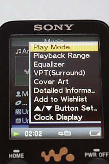 สิ่งที่ผมชอบในเมนูของเจ้า Walkman นั้นคือ ปุ่ม Option ครับ ปุ่ม Option จะทำหน้าที่แตกต่างกันไปในแต่ละหน้าต่างเมนู อย่างในเมนู Music เราสามารถเรียก Option ขึ้นมาปรับแต่งค่า ที่เกี่ยวกับการเล่นเพลงได้โดยไม่ต้อง Back ไปหน้า Home เพื่อเข้าเมนู Setting เลยครับ ดังรูปล่าง