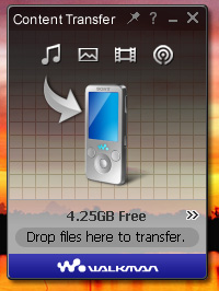 และลูกเล่นที่น่ารักๆอย่างหนึ่งของเจ้า Walkman คือโปรแกรม Content Transfer ครับ หากเราลงโปรแกรม Content Transfer ไว้แล้ว เมื่อเราเสียบวอล์คแมนเข้ากับพีซี มันก็จะรันตัวเองมาอัตโนมัติ สามารถลากไฟล์ลงไปในโปรแกรมได้ทันทีครับ