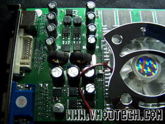 ภาคจ่ายไฟครับ เรียงเป็นระเบียบดี ใช้ C อิเล็กโทรไล แบบธรรมดา | นี่คู่เกย์เลยครับ ชิป NV43 (GeForce6200 GPU) และ HSI bridge chip |