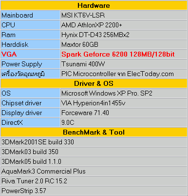 หวัดดีครับ ช้าไปหรือป่าวครับกับ GF6200 ที่เขาเทสกันทั้งบ้านทั้งเมืองแล้ว หุๆๆ วันนี้ไม่ขอแรงแซงใครครับ แต่ขอแสดงวิธี เปิดท่อ หรือ Pipeline แบบเป็นขั้นๆกันเลย พร้อม OC VGA ด้วยครับ อยากบอกไว้ตรงนี้เลยนะครับว่า VGA แรงจริง ที่ไม่แรงน่ะเครื่องผมครับ คะแนนออกมาก็พอใช้ได้ครับ เพื่อให้เห็นความแตกต่างของคะแนน ผมได้แบ่งหมวดการทดสอบออกเป็นดังนี้ครับ
