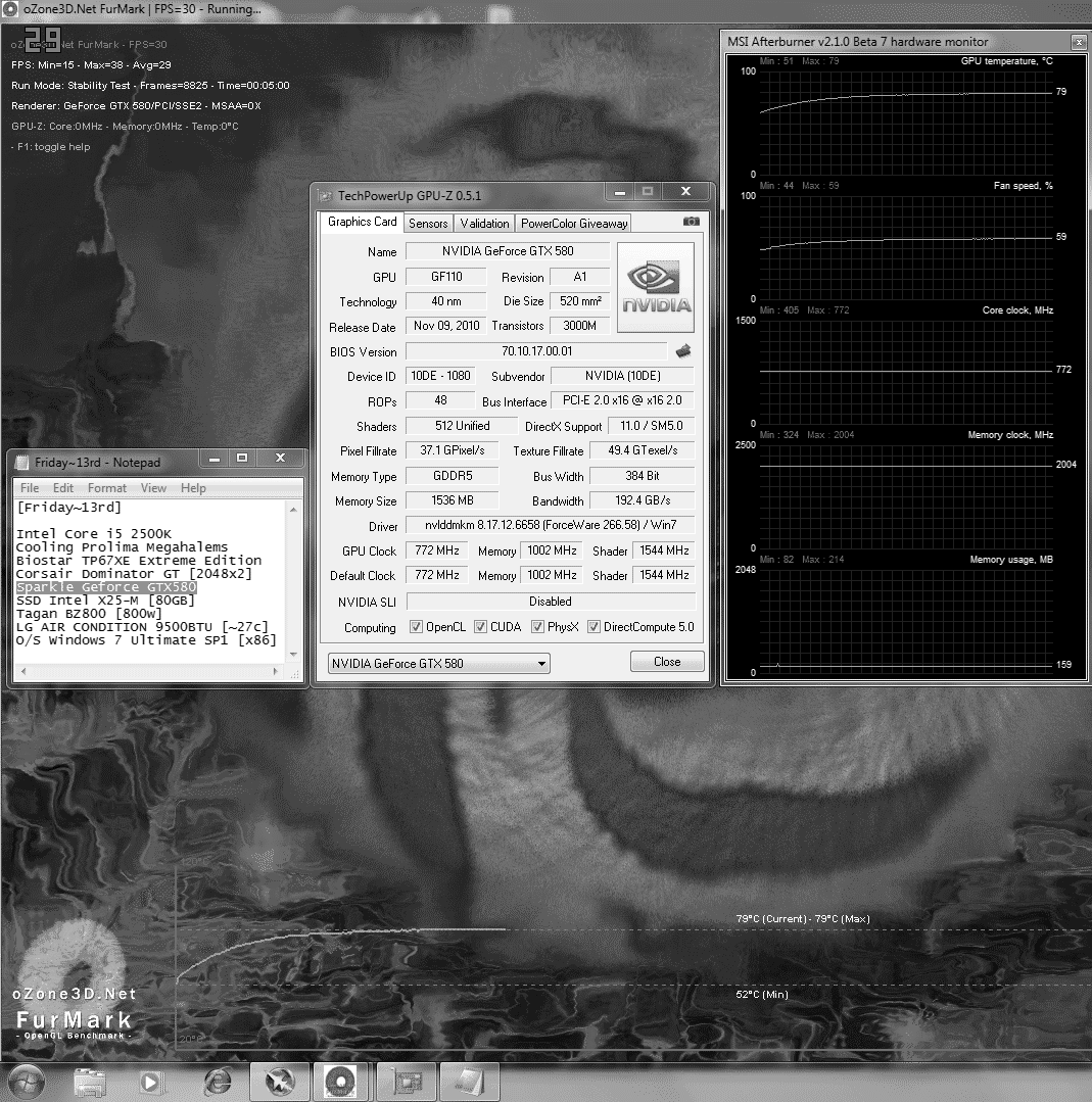อุณหภูมิที่เกิดขึ้น เผากับ Furmark เป็นเวลา 5 นาที สภาวะ Default ของการ์ดจอ พัดลมอยู่ในสถานะ Auto เจอไป 79 องศาC ก็ถือได้ว่าอุณหภูมิพอประมาณ ครั้นสภาวะ O/C มีการปรับแรงดันไฟ GPU ขึ้นมา และพัดลมล๊อคค้างไว้ที่ 85% อุณหภูมิสูงสุดที่เกิดขึ้น 59 องศาC ถือได้ว่าการ์ดฯ แค่อุ่นๆ ไม่ร้อนเลยครับ : )