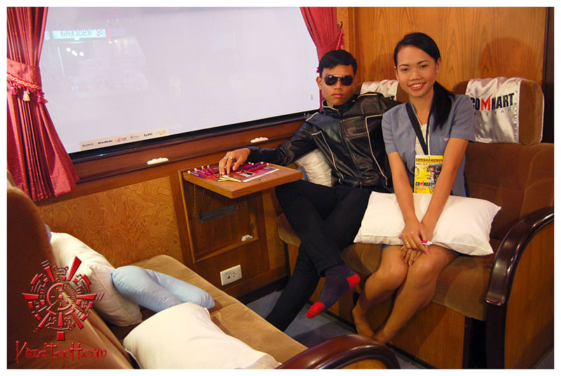 ท่านเทพยังคงอยู่ในงานCOMMARTนั่นเองครับ แต่ว่าท่านเทพได้เข้าไปเยี่ยมชมรถบัสสุดหรูของนครชัยทัวร์ ที่มีค่าเช่าเหมาแสนถูกที่วันละ10,000กว่าบาท รวมค่าน้ำมันและคนขับเรียบร้อยแล้ว ซึ่งสาวสวยที่ให้ข้อมูลบนรถบัสก็มาขอถ่ายรูปกับท่านเทพอีกตามระเบียบ เพราะทนความเร้าใจของลายถุงเท้ากับการแต่งกายของท่านเทพไม่ไหว ซึ่งท่านเทพเราก็เต็มใจแอ๊คท่าสุดหล่อให้ถ่ายรูปคู่ด้วยกันด้วยความเมตตาครับ อิอิ
