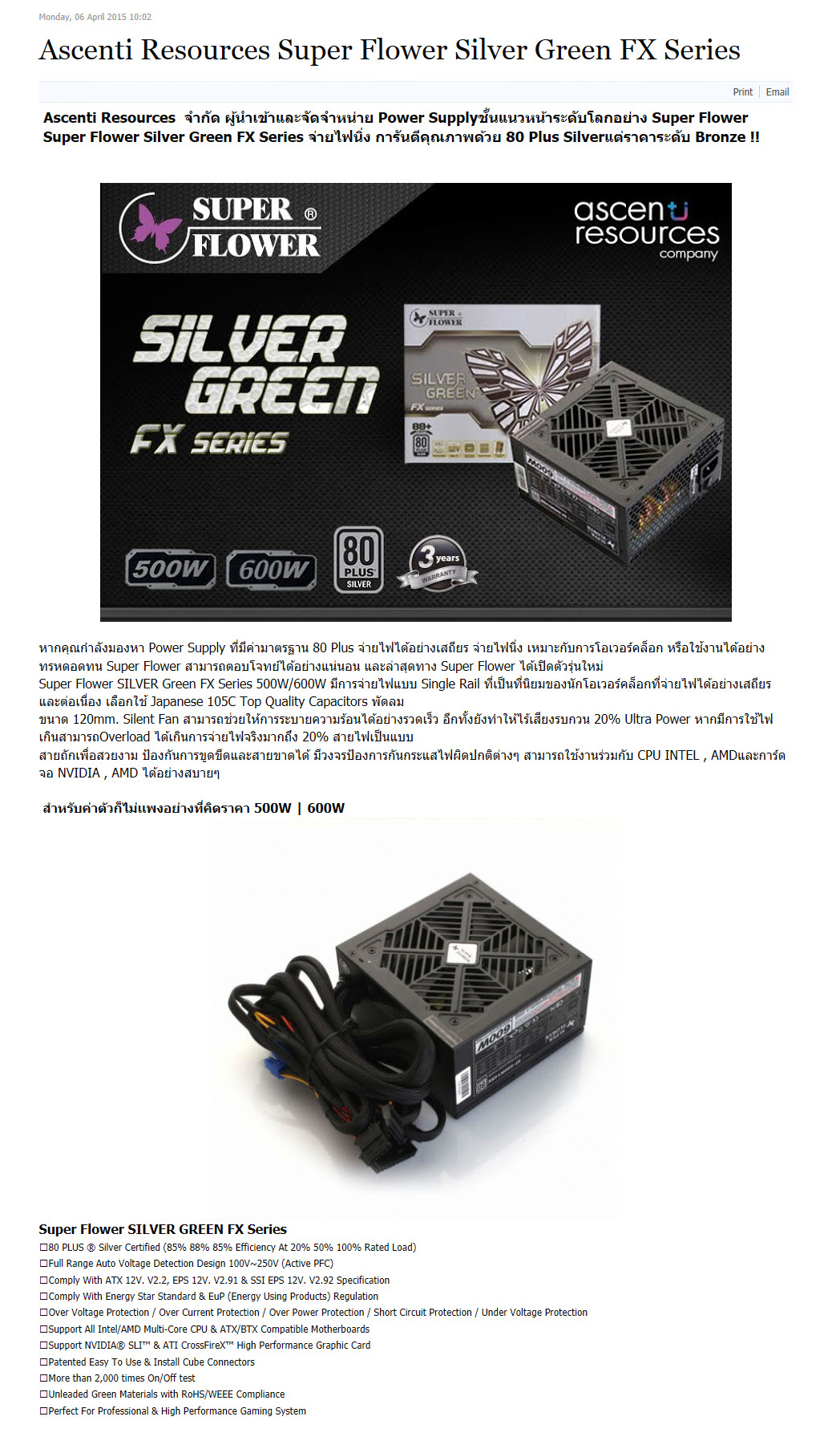 สวัสดีครับทุกๆท่านที่เยี่ยมชมเว็บไซต์ Vmodtech.com วันนี้เรามาชม PSU คุณภาพเยี่ยมอีกแบรนด์ครับนั่นก็คือ Super Flower ที่หลายๆท่านรู้จักกันดีถึงประสิทธิภาพ มากันในชื่อรุ่นเต็มๆว่า Super Flower Silver Green FX Series 500W 80 Plus Silver ที่ เป็น PSU คุณภาพเยี่ยมที่มีมาตรฐาน 80 PLUS Silver ที่ราคานั้นเท่ากับระดับ Bronze อีกทั้งยังมีค่า Efficiency โหลดถึง 88% หากมีการใช้ไฟเกินสามารถโอเวอร์โหลดได้เกินการจ่ายไฟจริงมากถึง 20% อีกด้วย เรียกได้ว่าทั้งประหยัดไฟในระดับ Silver รวมทั้งการจ่ายไฟก็แสนจะนิ่ง พร้อมทั้งมีคาปาซิเตอร์อย่าง Japanese 105C Top Quality Capacitors ไว้ควบคุมการทำงานอีกด้วย จัดเต็มขนาดนี้ประสิทธิภาพจะเป็นเช่นไร ก่อนอื่นไปชมรายละเอียดจากเว็บไซต์ผู้ผลิตกันก่อนครับ