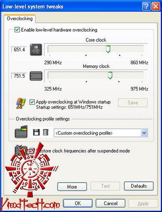 หลังจากที่ผมทดลองใช้ATIToolกับRivaTunerในการลากแล้ว ผมพบว่าRivaTunerสามารถลากได้ดีกว่าครับ โดยRivaTunerที่ความเร็ว651MHzนี้นั้นไม่มีอาการภาพแตกใดๆเลยแม้เปิดBenchmark3D วนLoopนานๆ แต่ATIToolเมื่อทิ้งไว้นานๆภาพจะเริ่มมีArtifactนิดๆ และคะแนนของAquamark3ที่ใช้RivaTunerในการลากจะมากกว่าใช้ATIToolอยู่นิดๆตลอดด้วย(500-800คะแนน) ดังนั้นในการทดสอบOverclockทั้งหมดนี้ ผมจะใช้RivaTunerในการลากนะครับ
