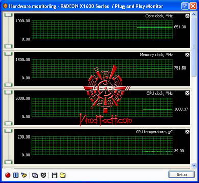 หลังจากลองลากความเร็วเพิ่มดูแล้ว เจ้าSpark X1600Pro Golden ก็ไม่ทำให้ผิดหวังกับรูปลักษณ์ระบบระบายความร้อนที่อลังการเลยครับ การเทสต์ในลักษณะนอกเคสและอยู่ในห้องปรับอากาศอุณหภูมิประมาณ24องศาเซลเซียส สามารถลากไปเสถียรภาพไม่แตกทุกการทดสอบได้ที่ความเร็วถึง651.38/1503MHzเลยครับ!!! ซึ่งความเร็วCoreที่650MHzนั้น เป็นความเร็วที่คล็อคได้สูงสุดของX1600XTรุ่นที่สูงกว่าเลยครับ เท่าที่ผมได้ดูๆมาในเวบไซต์ต่างประเทศ ส่วนความเร็วแรมยังเป็นรองX1600XTที่คล็อคสุดๆแล้วอยู่ประมาณ100MHz โดยแรมของX1600XTส่วนมากจะลากสุดๆได้ประมาณ1600MHz ทั้งนี้ก็เป็นไปตามความเร็วของชิปแรมที่ใช้แหละครับ เพราะตัวX1600XTใช้แรม1.2ns ส่วนSpark X1600Pro Goldenตัวนี้ใช้แรม1.4ns