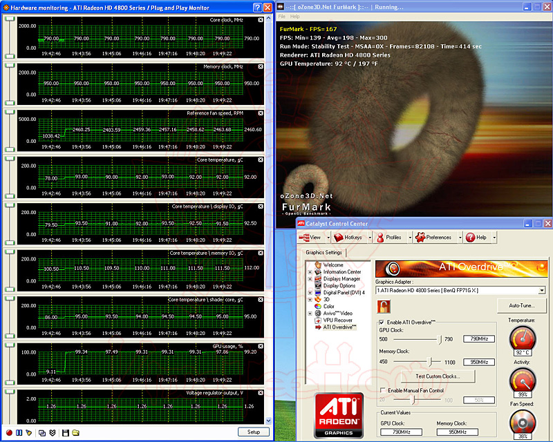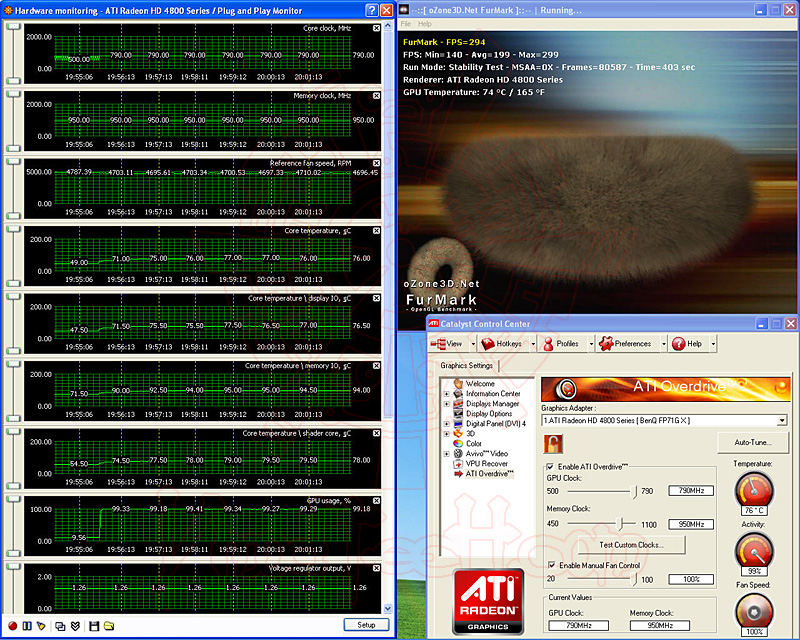 HD4870 790/950 Stock Cooler/Duty fan cycle= 100% |