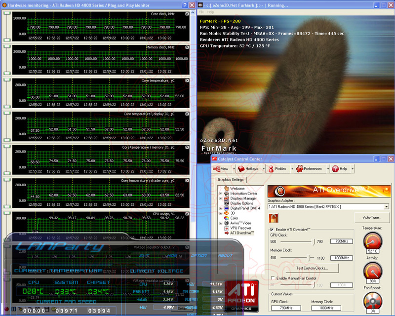 | มาถึงในช่วงการทดสอบ ก็ไม่มีอะไรมากครับทดสอบโดยใช้โปรแกรม Furmark Test ใน mode Stability Test เห็นว่ามันร้อนดีสามารถทำให้การ์ดของเราร้อนได้ในระดับใกล้เคียงหรือสูงกว่าการเล่นเกมส์(devil may cry4)เลยสำหรับโปรแกรมตัวนี้ ซึ่งผมลองทดสอบกับพวก3dmarkแล้วมันไม่ร้อนซักเท่าไหร่ ก็เลยเป็นเหตุผลที่เลือกเจ้าโปรแกรมตัวนี้มาใช้ทดสอบในครั้งนี้ การทดสอบมี4รูปแบบคือ ซิงก์เดิมติดการ์ดมาโดยปรับรอบพัดลมautoและปรับให้รอบพัดลมทำงานที่100% เสียงดังนรกแตกเลยครับขณะทำงานที่100%เนี่ย ส่วนที่เปลี่ยนเป็น Thermalright T-RAD² ก็ทดสอบสองความเร็วรอบพัดลม คือให้พัดลมทำงาน2400รอบ เสียงรบกวนน้อยมากกับ4000รอบ อันนี้เสียงก็ดังเอาเรื่องเลยเหมือนกันแต่เย็นลงได้อีก ทดสอบกันนอกเคสในอุณหูมิห้องประมาณ27-28องศาเซลเซียสเหมือนห้องจะเย็นแต่มันร้อนครับ ช่วงนี้คอมเพรสเซอร์แอร์ไม่ค่อยทำงานเลย เพราะสภาพอากาศภายนอกเย็นลงในช่วงต้นฤดูหนาวนั่นเอง ไปๆมาๆจะนอกเรื่องแล้วมาต่อกันดีกว่าว่าเจ้า T-RAD² มันเจ๋งมั๊ย | |