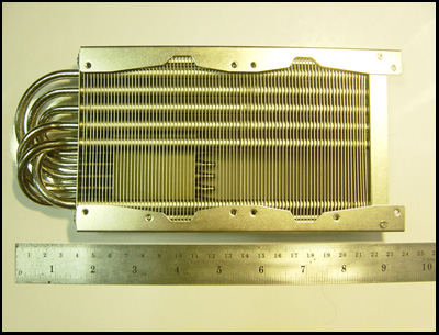 | มาชมทรวดทรงและรูปร่างหน้าตาของเจ้าT-RAD² กันซักหน่อย ผมเดาๆเอาว่าThermalright ตั้งใจทำมันออกมาให้คล้ายๆหม้อน้ำสองตอน คิดเหมือนผมมั๊ยครับ..อิอิ ใส่ฮีทไปป์นำความร้อนส่งผ่านสู่ตะแกรงมา6เส้น โดยท่อ5เส้นวิ่งขนานเป็นแนวเดียวกันไปด้านหนึ่ง แต่เหลือไปป์อีกเส้นที่มีพฤติกรรมทำเหมือนไม่มีใครคบแยกเดินไปคนละข้างกับไปป์อีก5เส้นก่อนหน้านี้เลย จริงๆคงไม่มีอะไรครับเป็นไปตามลักษณะที่ถูกบังคับตามกายภาพของมันนั่นเอง…งานเนี๊ยบทีเดียวครับสำหรับซิงก์ตัวนี้ |