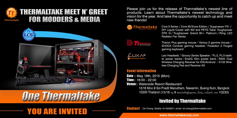 …สวัสดีครับ วันนี้ทาง Vmodtech.com เรา ก็ขอนำภาพบรรยากาศงาน Thermaltake Meet and Greet For Media ที่จัดขึ้นที่ Waterside Resort Restaurant เมื่อวันที่ 18 พฤภาคมที่ผ่านมา มาให้ชมกันนะครับ โดยงานนี้ทาง Thermaltake ก็ขนผลิตภัณฑ์ใหม่ๆมาโชว์ตัวกันเพียบเลยทีเดียว เดี๋ยวเราค่อยๆตามไปชมบรรยากาศกันได้เลยนะครับ
