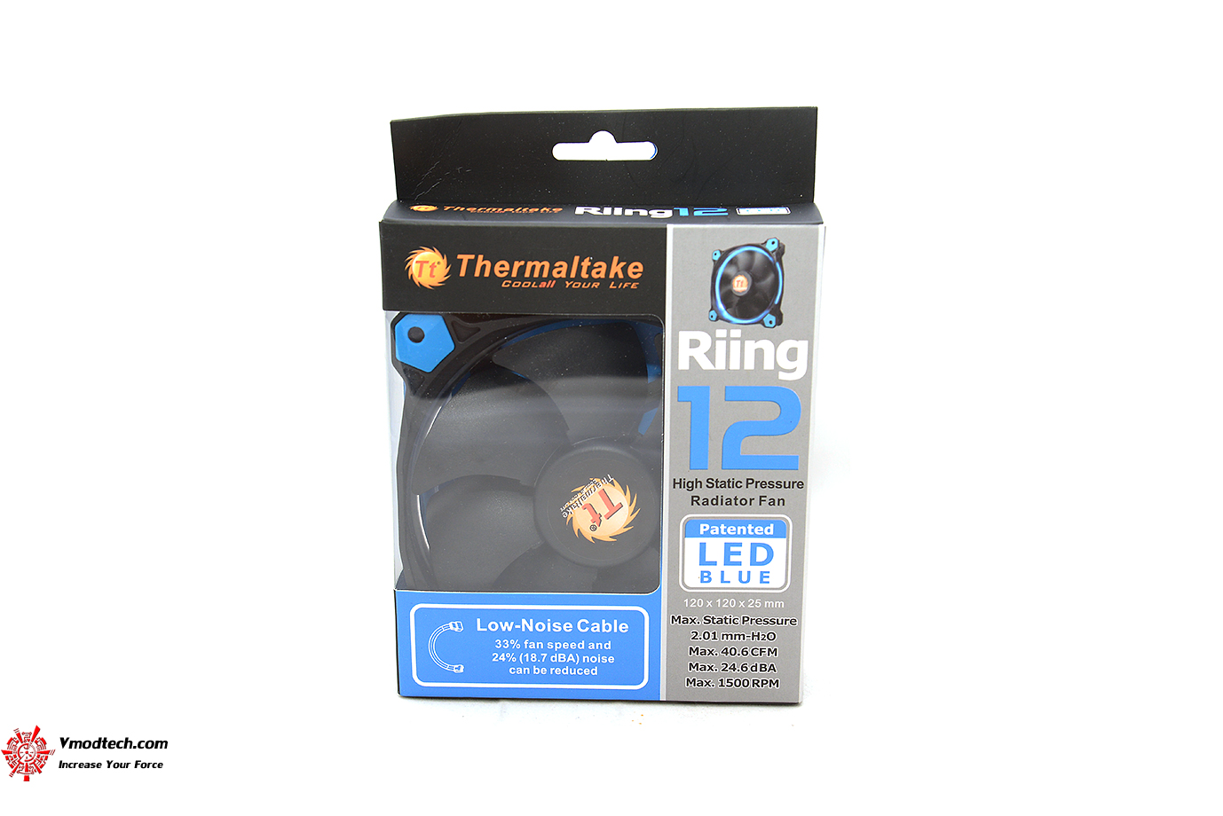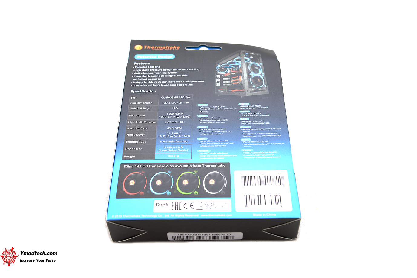 มากันในกล่องสีฟ้าสลับดำบอกรายละเอียดต่างๆของขนาดและสีของพัดลมครับ