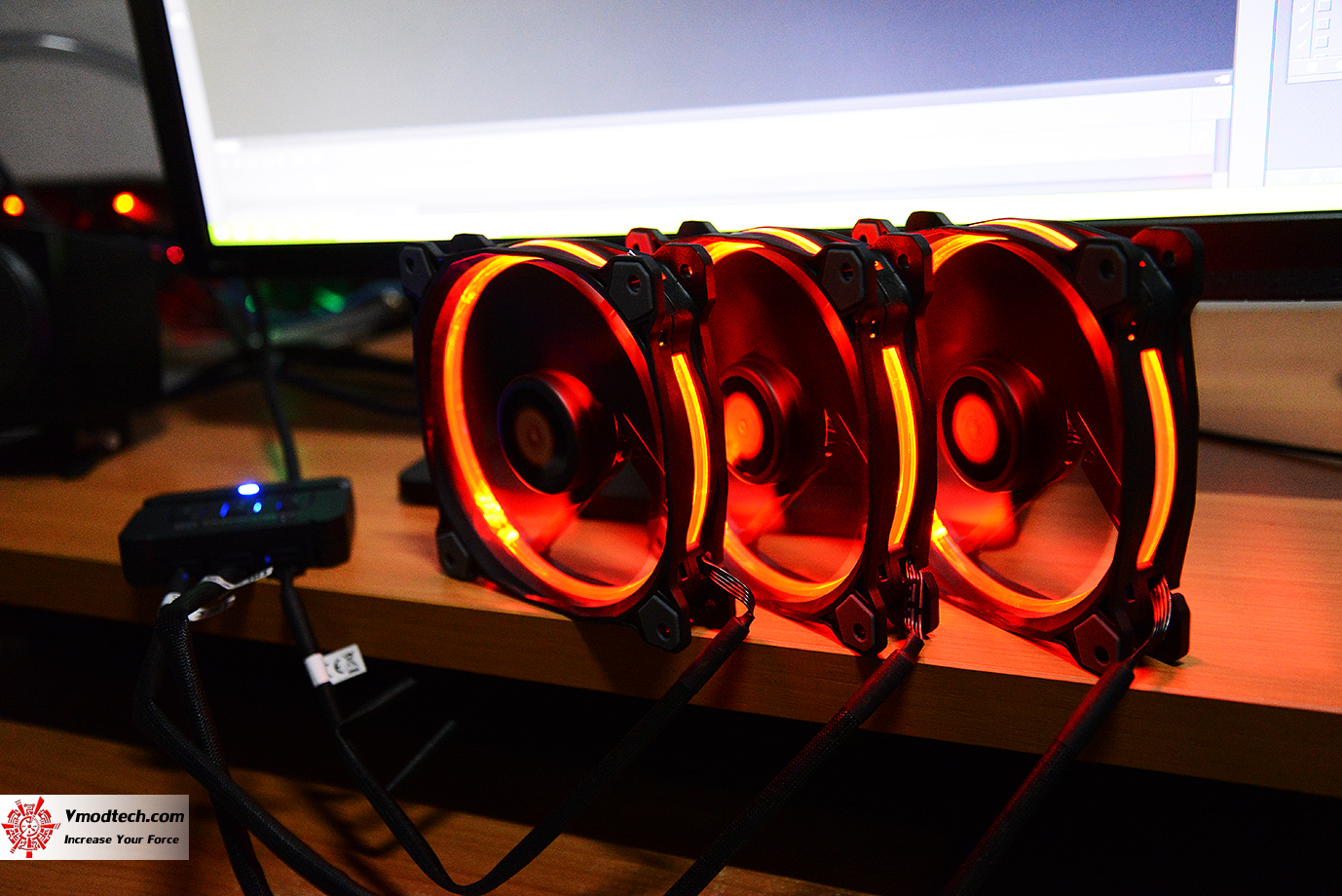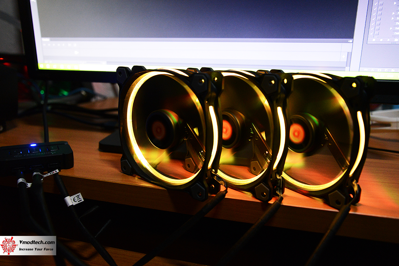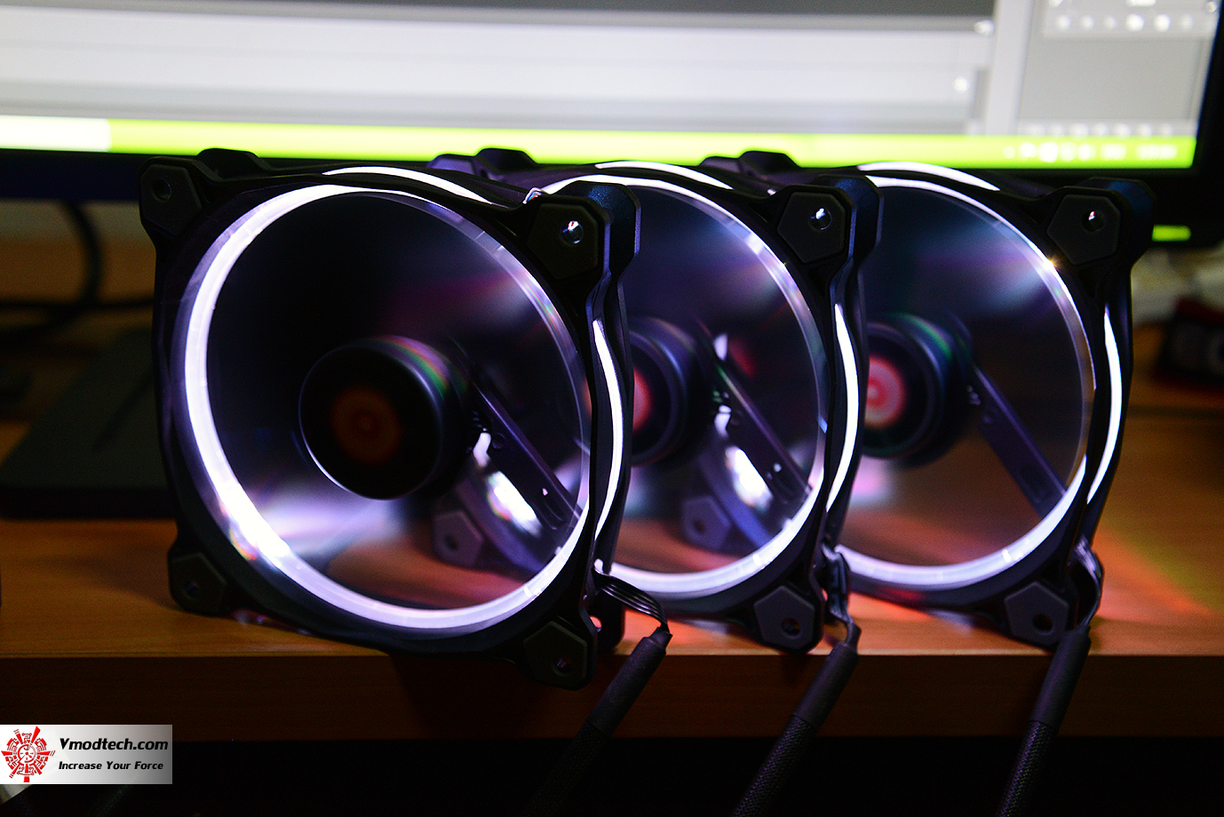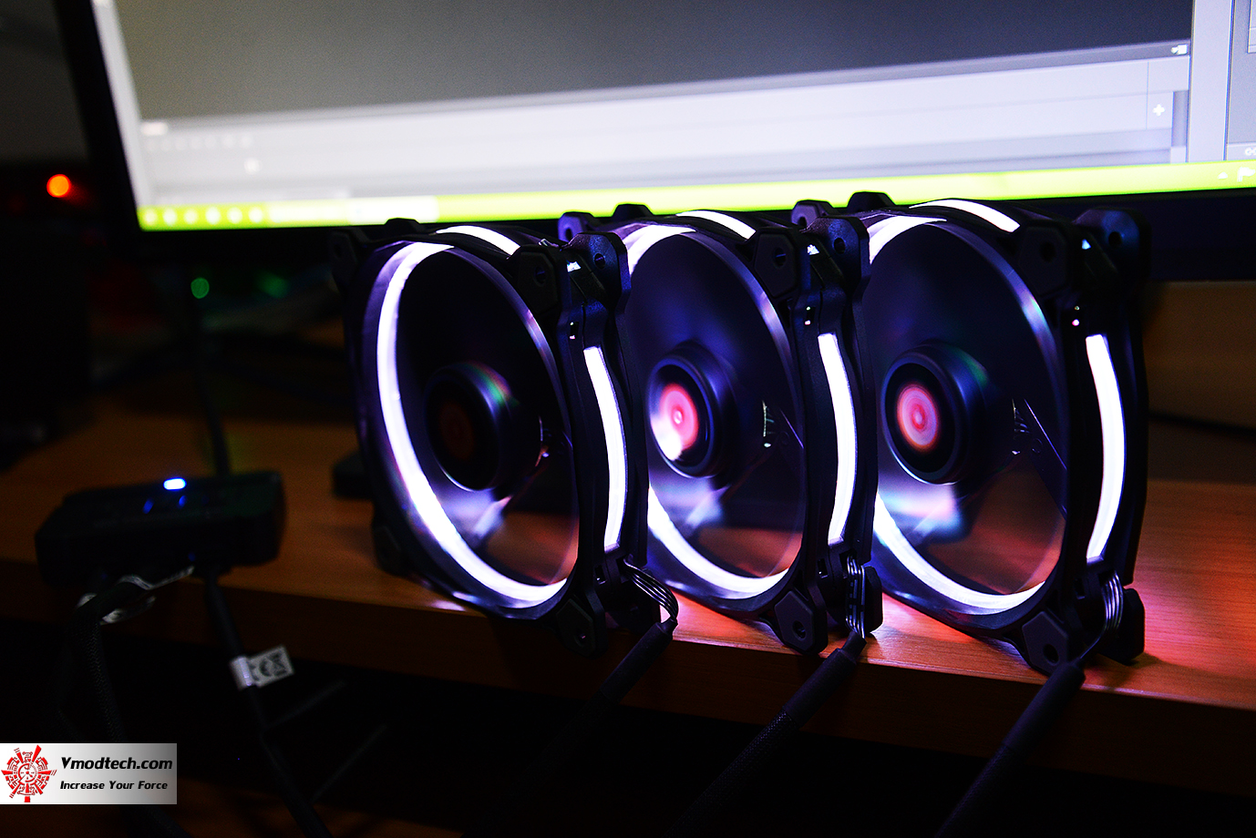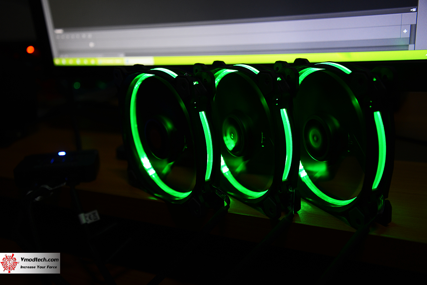 ก็มาถึงช่วงท้ายกันครับสำหรับการทดสอบ Thermaltake Riing 12 LED RGB Fan ที่วันนี้ต้องบอกว่าเป็นชุดควบคุมพัดลมที่เน้นสำหรับขา MOD จริงๆทั้งความสวยงาม สีสรรต่างๆที่ออกแบบมาได้อย่างอลังการมากครับ เพราะให้สีมากมากถึง 12สีกันเลยทีเดียวและถ้านับจริงๆมันก็วนลูปมากถึง 256สี RGB กันเลยทีเดียวครับ ในส่วนของการติดตั้ง Thermaltake Riing 12 LED RGB Fan จะมีแผ่นรองกันกระแทกติดตั้งไว้ทั้ง 4มุมซับแรงสั่นสะเทือนช่วยลดเสียงรบกวนไว้ให้ครับ ในส่วนของใบพัดก็มีการออกแบบของเทคโนโลยี Concentrated Compression Blade (CCB) ที่ออกแบบมาให้แรงลมไหลผ่านได้ดีกว่าพัดลมที่ติดเคสทั่วๆไป รวมทั้งลดการเกิดเสียงรบกวนได้ดีอย่างมากครับ อันนี้ตามที่ผมทดสอบเรื่องเสียงรบกวนนี่ไม่น่ามีปัญหาครับเพราะเบามากๆ มาดูเรื่องของแรงลมอันนี้สำคัญครับสำหรับผู้เลือกใช้พัดลมที่ไม่ได้เน้นความสวยงามเพียงอย่างเดียวแต่เน้นในเรื่องของการใช้งานจริงโดย Thermaltake Riing 12 LED RGB Fan นั้นทำแรงลมออกมาอยู่ 22.14 ~ 40.6 CFM ถือว่าโอเคครับ แต่จุดเด่นหลักๆจริงๆของ Thermaltake Riing 12 LED RGB Fan ในวันนี้ก็คือลูกเล่นการทำงานต่างๆและความสวยงามของแสงไฟ LED ของพัดลมที่ทำออกมาเอาใจนัก MOD ที่เน้นการตกแต่งเคสอย่างแท้จริงครับ กับการใช้งานที่ไม่ยุ่งยากอะไรครับการติดตั้งก็แค่เสียบลงไปที่ช่อง FAN ช่องใดก็ได้ของเมนบอร์ดซึ่งมันก็มีอยู่เกือบทุกมุมถือว่าออกแบบมาให้ติดตั้งได้ง่ายพอสมควร เอาเป็นว่าถ้าท่านเป็นนัก MOD แต่งเคสหรือกำลังมองมองหาชุดพัดลม 3ชุดมาใส่หม้อน้ำ 3ตอน Thermaltake Riing 12 LED RGB Fan น่าจะเป็นตัวเลือกที่น่าสนใจอยู่ไม่น้อยเลยครับ สำหรับราคาวางจำหน่ายในไทยประมาณ 21XXบาทครับ สำหรับ ในวันนี้กระผมก็ขอตัวลาไปก่อน พบกันใหม่เร็วๆนี้กับรีวิวอุปกรณ์ใหม่ๆจัดเต็มทุกการทดสอบที่ Vmodtech.com สวัสดีครับ