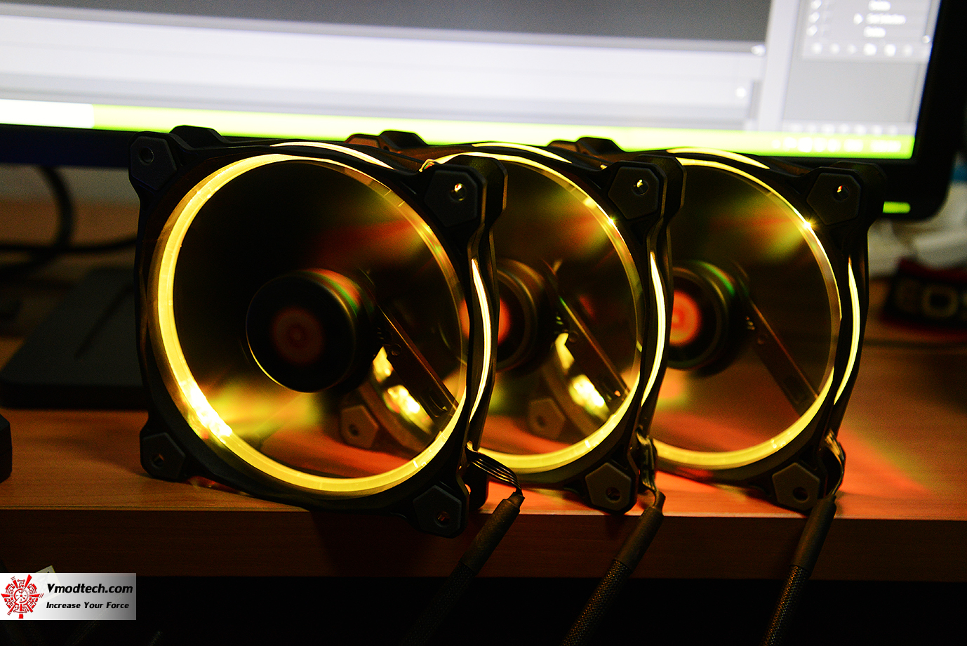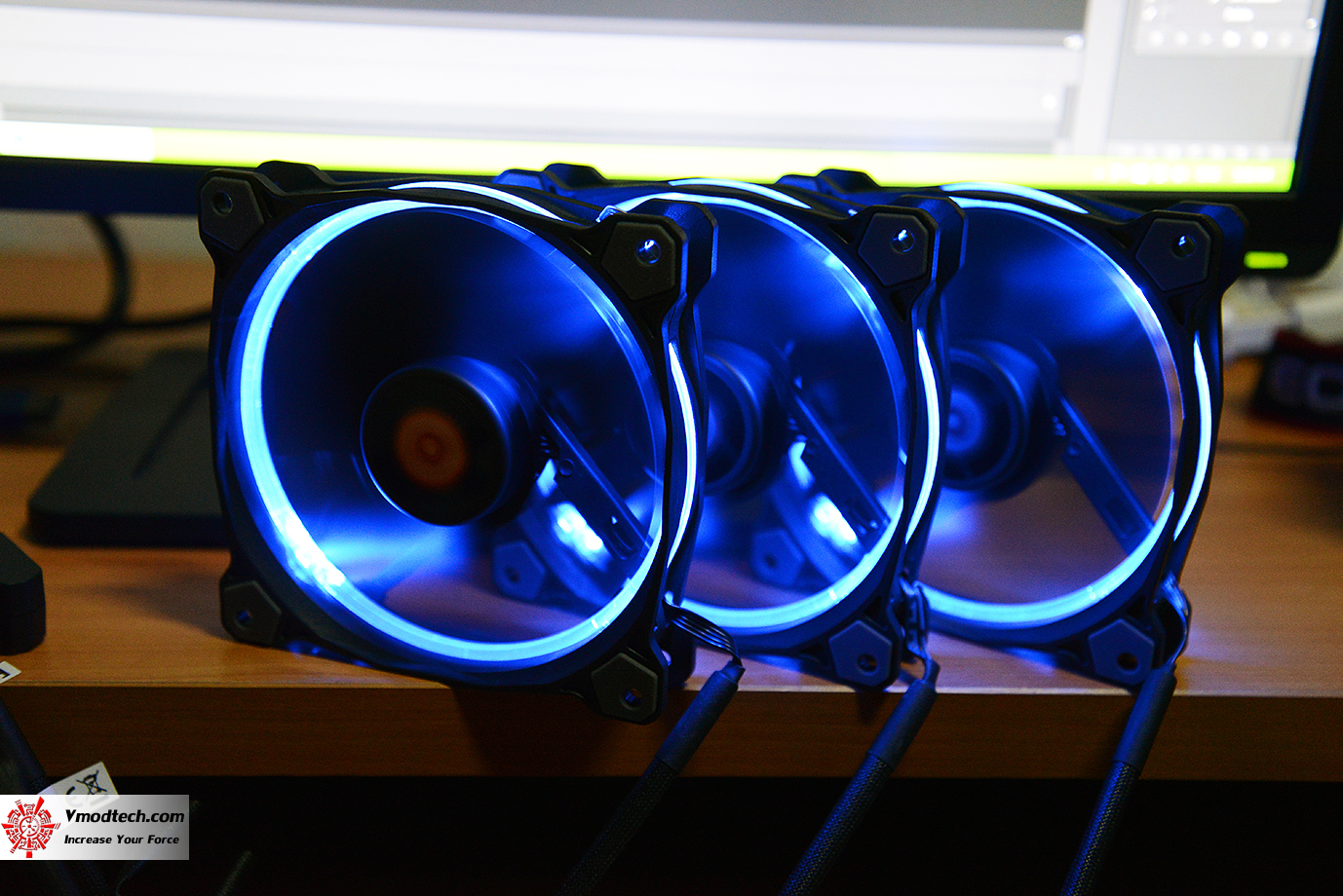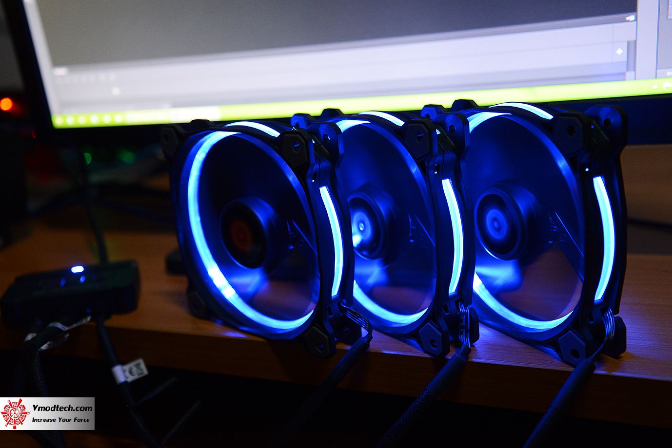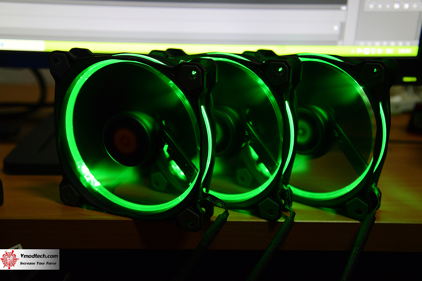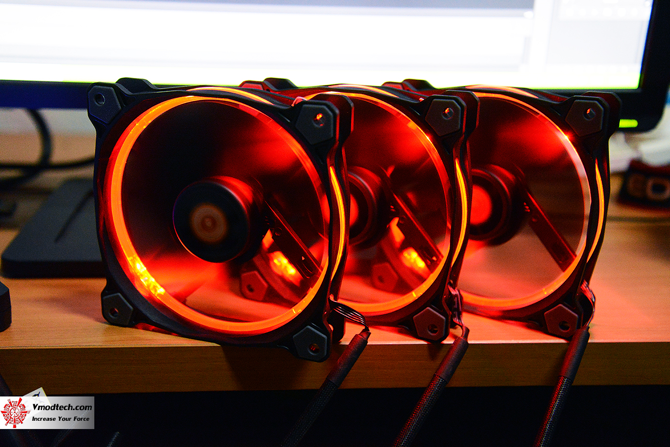 ก็มาถึงช่วงท้ายกันครับสำหรับการทดสอบ Thermaltake Riing 12 LED RGB Fan ที่วันนี้ต้องบอกว่าเป็นชุดควบคุมพัดลมที่เน้นสำหรับขา MOD จริงๆทั้งความสวยงาม สีสรรต่างๆที่ออกแบบมาได้อย่างอลังการมากครับ เพราะให้สีมากมากถึง 12สีกันเลยทีเดียวและถ้านับจริงๆมันก็วนลูปมากถึง 256สี RGB กันเลยทีเดียวครับ ในส่วนของการติดตั้ง Thermaltake Riing 12 LED RGB Fan จะมีแผ่นรองกันกระแทกติดตั้งไว้ทั้ง 4มุมซับแรงสั่นสะเทือนช่วยลดเสียงรบกวนไว้ให้ครับ ในส่วนของใบพัดก็มีการออกแบบของเทคโนโลยี Concentrated Compression Blade (CCB) ที่ออกแบบมาให้แรงลมไหลผ่านได้ดีกว่าพัดลมที่ติดเคสทั่วๆไป รวมทั้งลดการเกิดเสียงรบกวนได้ดีอย่างมากครับ อันนี้ตามที่ผมทดสอบเรื่องเสียงรบกวนนี่ไม่น่ามีปัญหาครับเพราะเบามากๆ มาดูเรื่องของแรงลมอันนี้สำคัญครับสำหรับผู้เลือกใช้พัดลมที่ไม่ได้เน้นความสวยงามเพียงอย่างเดียวแต่เน้นในเรื่องของการใช้งานจริงโดย Thermaltake Riing 12 LED RGB Fan นั้นทำแรงลมออกมาอยู่ 22.14 ~ 40.6 CFM ถือว่าโอเคครับ แต่จุดเด่นหลักๆจริงๆของ Thermaltake Riing 12 LED RGB Fan ในวันนี้ก็คือลูกเล่นการทำงานต่างๆและความสวยงามของแสงไฟ LED ของพัดลมที่ทำออกมาเอาใจนัก MOD ที่เน้นการตกแต่งเคสอย่างแท้จริงครับ กับการใช้งานที่ไม่ยุ่งยากอะไรครับการติดตั้งก็แค่เสียบลงไปที่ช่อง FAN ช่องใดก็ได้ของเมนบอร์ดซึ่งมันก็มีอยู่เกือบทุกมุมถือว่าออกแบบมาให้ติดตั้งได้ง่ายพอสมควร เอาเป็นว่าถ้าท่านเป็นนัก MOD แต่งเคสหรือกำลังมองมองหาชุดพัดลม 3ชุดมาใส่หม้อน้ำ 3ตอน Thermaltake Riing 12 LED RGB Fan น่าจะเป็นตัวเลือกที่น่าสนใจอยู่ไม่น้อยเลยครับ สำหรับราคาวางจำหน่ายในไทยประมาณ 21XXบาทครับ สำหรับ ในวันนี้กระผมก็ขอตัวลาไปก่อน พบกันใหม่เร็วๆนี้กับรีวิวอุปกรณ์ใหม่ๆจัดเต็มทุกการทดสอบที่ Vmodtech.com สวัสดีครับ