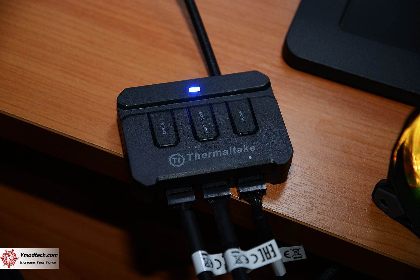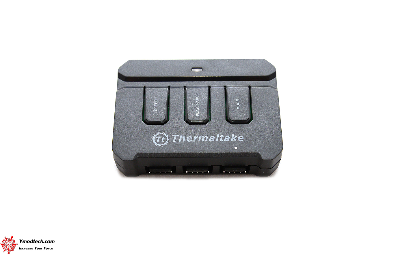 ชุดควบคุมการทำงานครับ จะต่อสายไฟพัดลมทั้ง 3ชุด และมีปุ่มควบคุมการทำงาน 3ปุ่มก็คือ Speed เอาไว้เร่งความเร็วพัดลมโดยรอบสูงสุดอยู่ที่ 1500รอบต่อนาที หรือท่านจะปรับเป็นโหมดเงียบก็จะอยู่ราวๆ 1000รอบต่อนาที ส่วนปุ่มที่สองคือปุ่มเล่นและหยุดการทำงานของพัดลม ปุ่มที่สามคือปรับโหมดการทำงานคือท่านสามารถเลือกสีทั้ง 12สีพัดลมตามที่ต้องการก็ได้หรือท่านจะกำหนดให้วนลูปแสดงทุกสี 256สีเลยก็ได้ หรือปิดสีไปเลยก็ได้ เรียกได้ว่าทำได้คลอบคลุมจริงๆ เดี๋ยวเราไปชมตัวอย่างของสีต่างๆที่แสดงพร้อมทั้งวีดีโอแสดงการทำงานการวนลูปของชุดพัดลม Thermaltake Riing 12 LED RGB Fan กันครับ