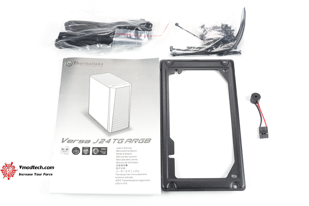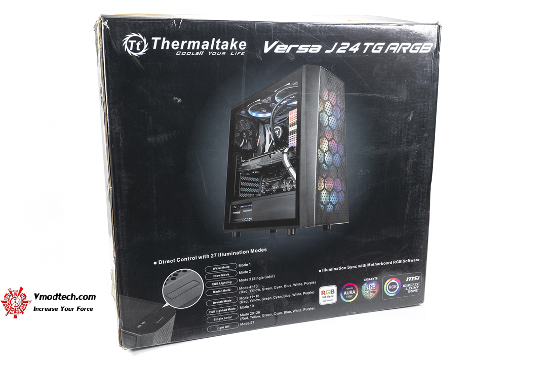 สวัสดีครับสมาชิกเว็บไซด์ Vmodtech.com ทุกท่าน วันนี้เรามีเคสรุ่นใหม่อีกรุ่นนึงจาก Thermaltake มารีวิวให้ได้ชมกัน เคส Thermaltake Versa J24 Tempered Glass RGB Edition ตัวนี้มีจุดเด่นที่ตัวฝาข้างเป็นกระจก Tempered Glass หรือ กระจกเทมเปอร์มาเป็นบานหน้าต่างเพื่อโชว์ความงดงามและห้องเครื่องของเคสของเราครับ รวมถึงคุณสมบัติของเทมเปอร์กลาสนั้นเป็นกระจกที่มีความแข็งแรงกว่ากระจกปกติที่มีขนาดความหนาเท่ากันและที่สำคัญหากเกิดความผิดปกติขั้นรุนแรง และจุดที่พิเศษสำหรับเคสรุ่นนี้คือตัวเคสนั้นได้ติดตั้งพัดลมที่สามารถแสดงแสงสีแบบ RGB ได้ ปรับแต่งสีและเอฟเฟกได้ง่ายๆจากปุ่มที่เคสเลย สะดวกมาก ยังสามารถที่จะเชื่อมต่อเพื่อ Sync แสงสีและเอฟเฟกให้ทำงานสอดคล้องไปกับแสงสีบนมาเธอร์บอร์ด ซึ่งสามารถซิงค์กับบอร์ดได้หลากหลายคือ ASUS Aura Sync, GIGABYTE RGB Fusion, MSI Mystic Light Sync, ASRock RGB LED, and BIOSTAR Vivid LED DJ เชื่อมต่อได้กับมาเธอร์บอร์ดที่วางจำหน่ายในเมืองไทยแทบทุกแบรนด์เลยทีเดียว เรามาชมรายละเอียดจากหน้าเว็บไซด์ของ Thermaltake และแกะกล่องกันเลยสำหรับ Thermaltake Versa J24 Tempered Glass RGB Edition