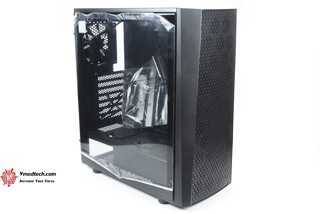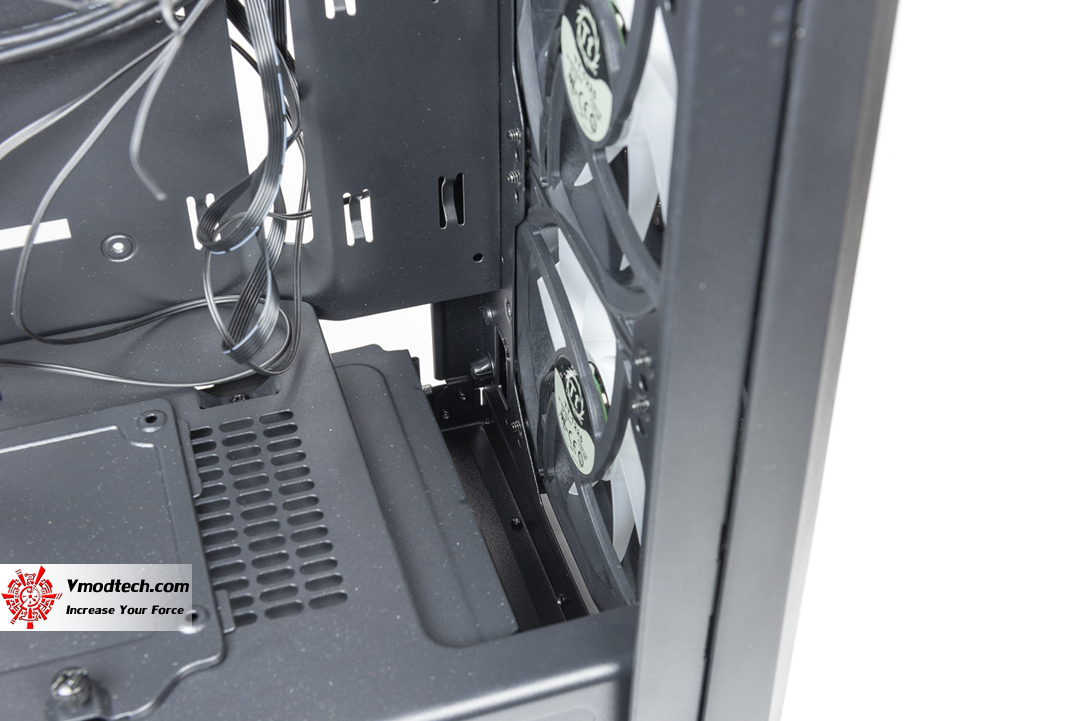 ที่ด้านในฝั่งหน้าของเคสนั้นจะเป็นพื้นที่ที่เราสามารถติดตั้งพัดลมหรือหม้อน้ำที่มีขนาด 12 มิลลิเมตรสามท่อนได้เลยครับ โดยต้องขยับฝาครอบด้านหน้าออกก่อน พื้นที่ถือว่าไม่กว้างไม่แคบ