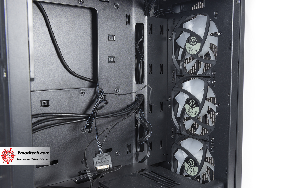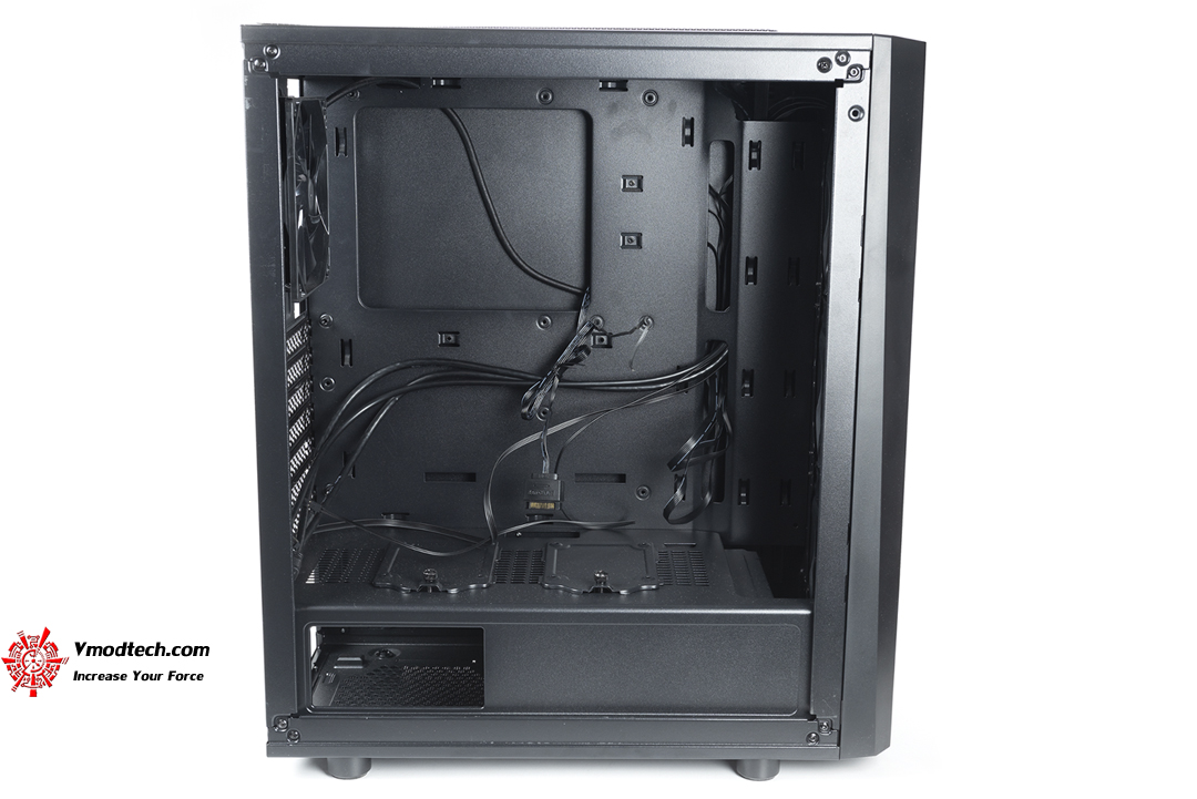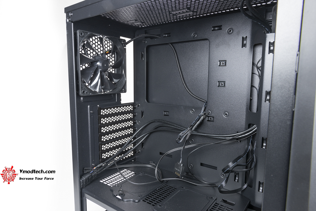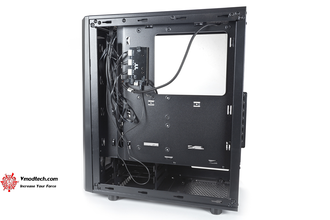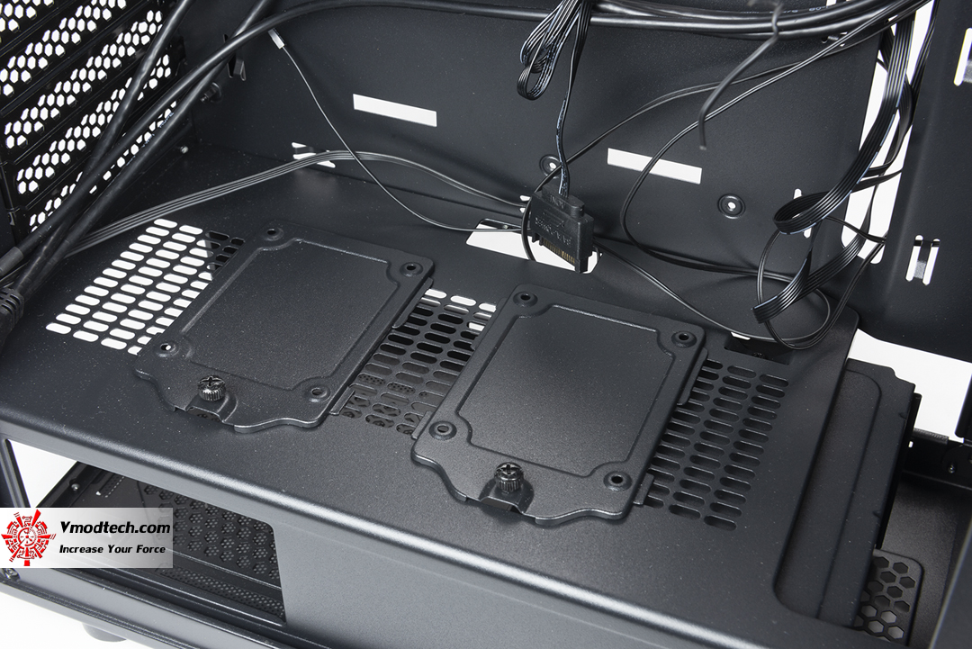 ภาพจากด้านหลังเคสด้านในครับ ตรงนี้จะเห็นได้เลยครับว่าพื้นที่ด้านหลังนั้นมีความลึกมากพอสมควร มันมีพื้นที่ที่ให้เราสามารถจัดสายได้สะดวกมากกว่าปกติ เรียกว่าหากเป็นคนที่ชอบติดตั้งแบบง่ายๆหรือว่าไม่มีประสบการณ์ในการจัดแต่งสายละก็สบายเลยทีเดียว ปล่อยลอยๆไว้ก็ได้ครับพื้นที่เหลือเฟือเลย และจากด้านหลังนี้เราสามารถติดตั้ง HDD/SSD ได้สองตัวด้วย