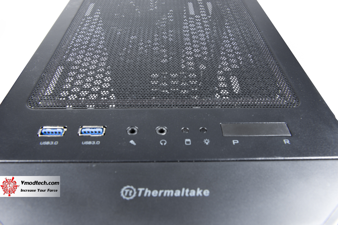 ปุ่มควบคุมที่มีก็จะครบถ้วนสำหรับการใช้งานเลยทีเดียว ด้านซ้ายสุดจะเป็นพอร์ท USB 3.0 โดยนำสายจากเคสไปเสียบกับมาเธอร์บอร์ด ด้านขวาสุดที่เขียนไว้ว่า R นั้นคือ RGB Button หรือสวิทซ์สำหรับปรับเปลี่ยนแสงสีโดยสามารถสลับได้สี่โหมดครับ