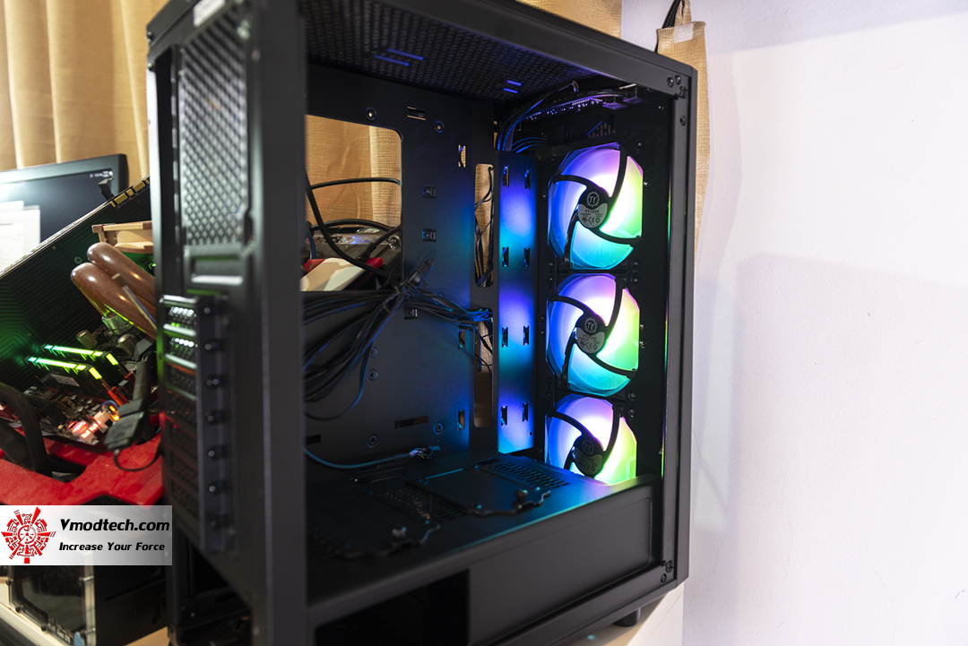 และจุดที่พิเศษสำหรับเคสรุ่นนี้คือตัวเคสนั้นได้ติดตั้งพัดลมที่สามารถแสดงแสงสีแบบ RGB ได้ ปรับแต่งสีและเอฟเฟกได้ง่ายๆจากปุ่มที่เคสเลย สะดวกมาก ยังสามารถที่จะเชื่อมต่อเพื่อ Sync แสงสีและเอฟเฟกให้ทำงานสอดคล้องไปกับแสงสีบนมาเธอร์บอร์ด ซึ่งสามารถซิงค์กับบอร์ดได้หลากหลายคือ ASUS Aura Sync, GIGABYTE RGB Fusion, MSI Mystic Light Sync, ASRock RGB LED, and BIOSTAR Vivid LED DJ เชื่อมต่อได้กับมาเธอร์บอร์ดที่วางจำหน่ายในเมืองไทยแทบทุกแบรนด์เลยทีเดียวครับ น่าสนใจมากสำหรับใครที่กำลังมองหาเคสใหม่ที่มีแสงสีในตัว ปรับแต่งเองได้และสามารถทำงานสอดคล้องกับมาเธอร์บอร์ดและการ์ดจอได้ด้วย ลองพิจารณาครับ