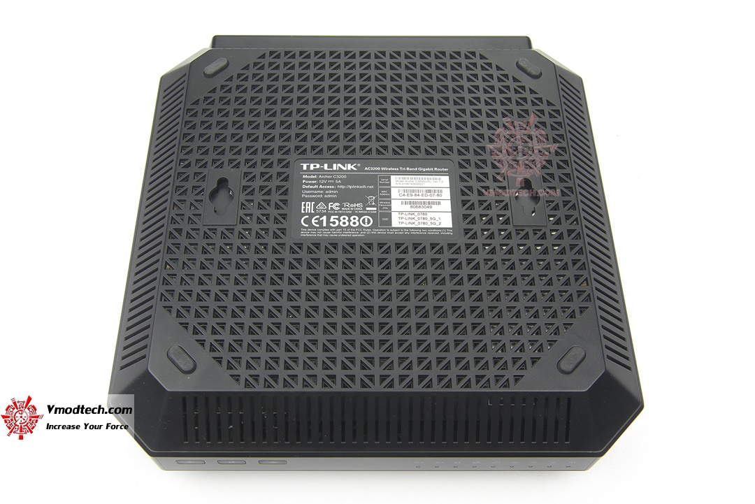 หงายด้านล่างของ TP-LINK Archer C3200 ก็จะเห็นการออกแบบให้ตัวถังนั้นถูกยกขึ้นช่วยระบายความร้อนเล็กน้อยรวมถึงมีการเซาะร่องระบายความร้อนไว้เต็มพื้นที่ ตัวถังนั้นสามารถยึดแขวนเข้ากับผนังได้ด้วย